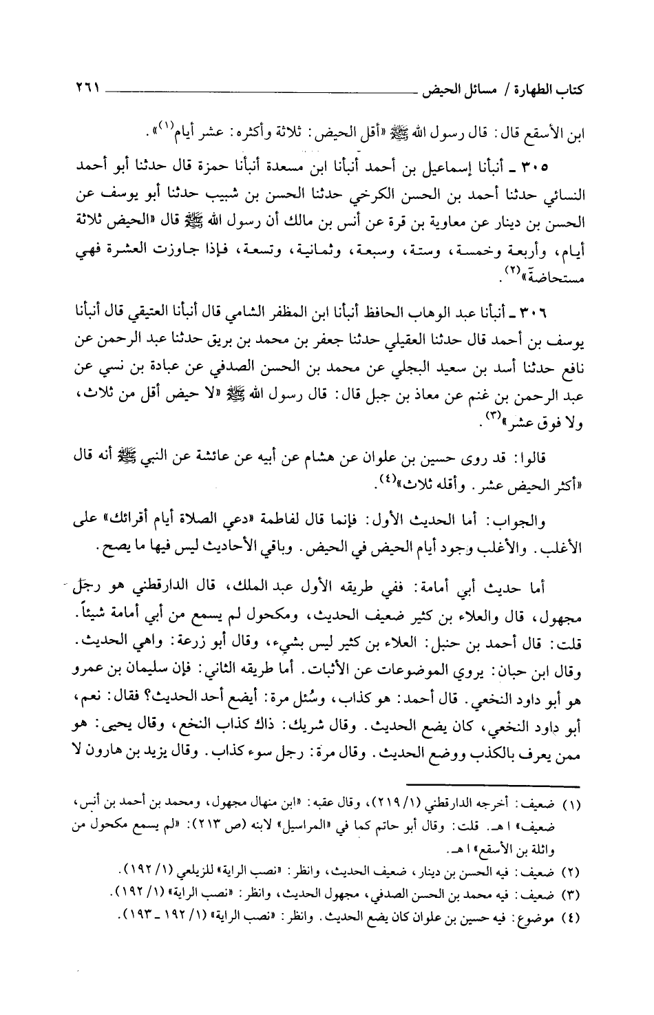 306 - أَنْبَأَنَا عَبْدُ الْوَهَّابِ الْحَافِظُ أَنْبَأَنَا ابْنُ الْمُظَفَّرِ الشَّامِيُّ قَالَ أَنْبَأَنَا الْعَتِيقِيُّ قَالَ أَنْبَأَنَا يُوسُفُ بْنُ أَحْمَدَ قَالَ حَدَّثَنَا الْعُقَيْلِيُّ حَدَّثَنَا جَعْفَرُ بْنُ مُحَمَّدِ بْنِ بُرَيْقٍ حَدَّثَنَا عَبْدُ الرَّحْمَنِ عَنْ نَافِعٍ حَدَّثَنَا أَسَدُ بْنُ سَعِيدٍ الْبَجَلِيُّ عَنْ مُحَمَّدِ بْنِ الْحَسَنِ الصَّدَفِيِّ عَنْ عُبَادَةَ بْنِ نُسَيٍّ عَنْ عَبْدِ الرَّحْمَنِ بْنِ غُنْمٍ عَنْ مُعَاذِ بْنِ جَبَلٍ قَالَ قَالَ رَسُولُ اللَّهِ صَلَّى اللَّهُ عَلَيْهِ وَسَلَّمَ لَا حَيْضَ أَقَلَّ مِنْ ثَلَاثٍ وَلَا فَوْقَ عَشْرٍ