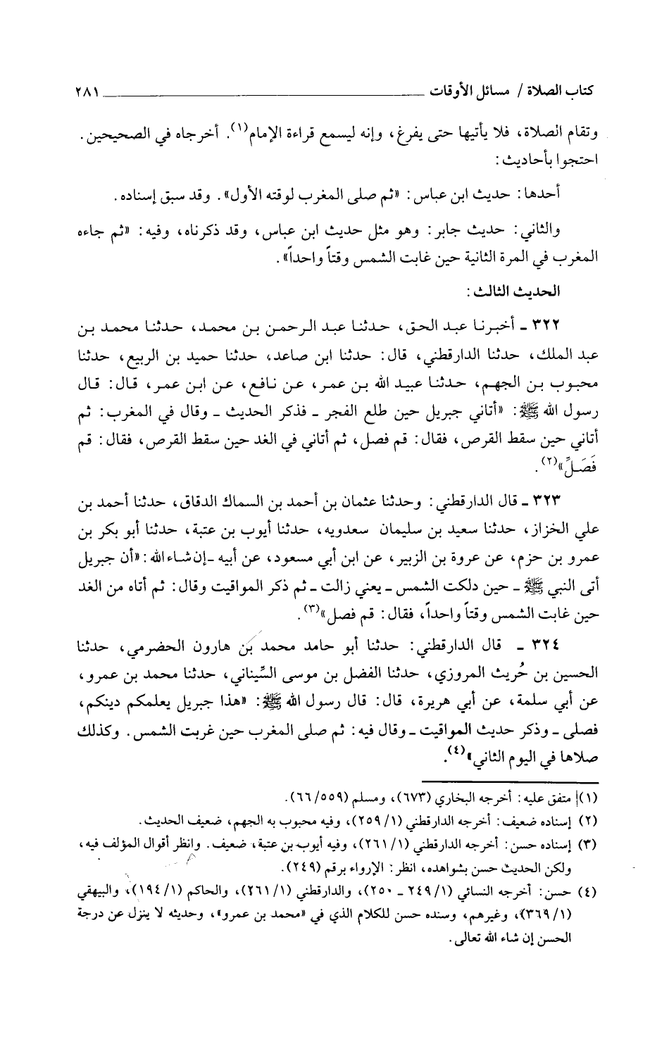 324 - قَالَ الدَّارَقُطْنِيُّ حَدَّثَنَا أَبُو حَامِدٍ مُحَمَّدُ بْنُ هَارُونَ الْحَضْرَمِيُّ حَدَّثَنَا الْحُسَيْنُ بْنُ حُرَيْثٍ الْمَرْوَزِيُّ حَدَّثَنَا الْفَضْلُ بْنُ مُوسَى السِّينَانِيُّ حَدَّثَنَا مُحَمَّدُ بْنُ عَمْرٍو عَنْ أَبِي سَلَمَةَ عَنْ أَبِي هُرَيْرَةَ قَالَ قَالَ رَسُولُ اللَّهِ صَلَّى اللَّهُ عَلَيْهِ وَسَلَّمَ هَذَا جِبْرِيلُ يُعَلِّمُكُمْ دِينَكُمْ فَصَلَّى وَذَكَرَ حَدِيثَ الْمَوَاقِيتِ وَقَالَ فِيهِ ثُمَّ صَلَّى الْمَغْرِبَ حِينَ غَرَبَتِ الشَّمْسُ وَكَذَلِكَ صَلَّاهَا فِي الْيَوْمِ الثَّانِي