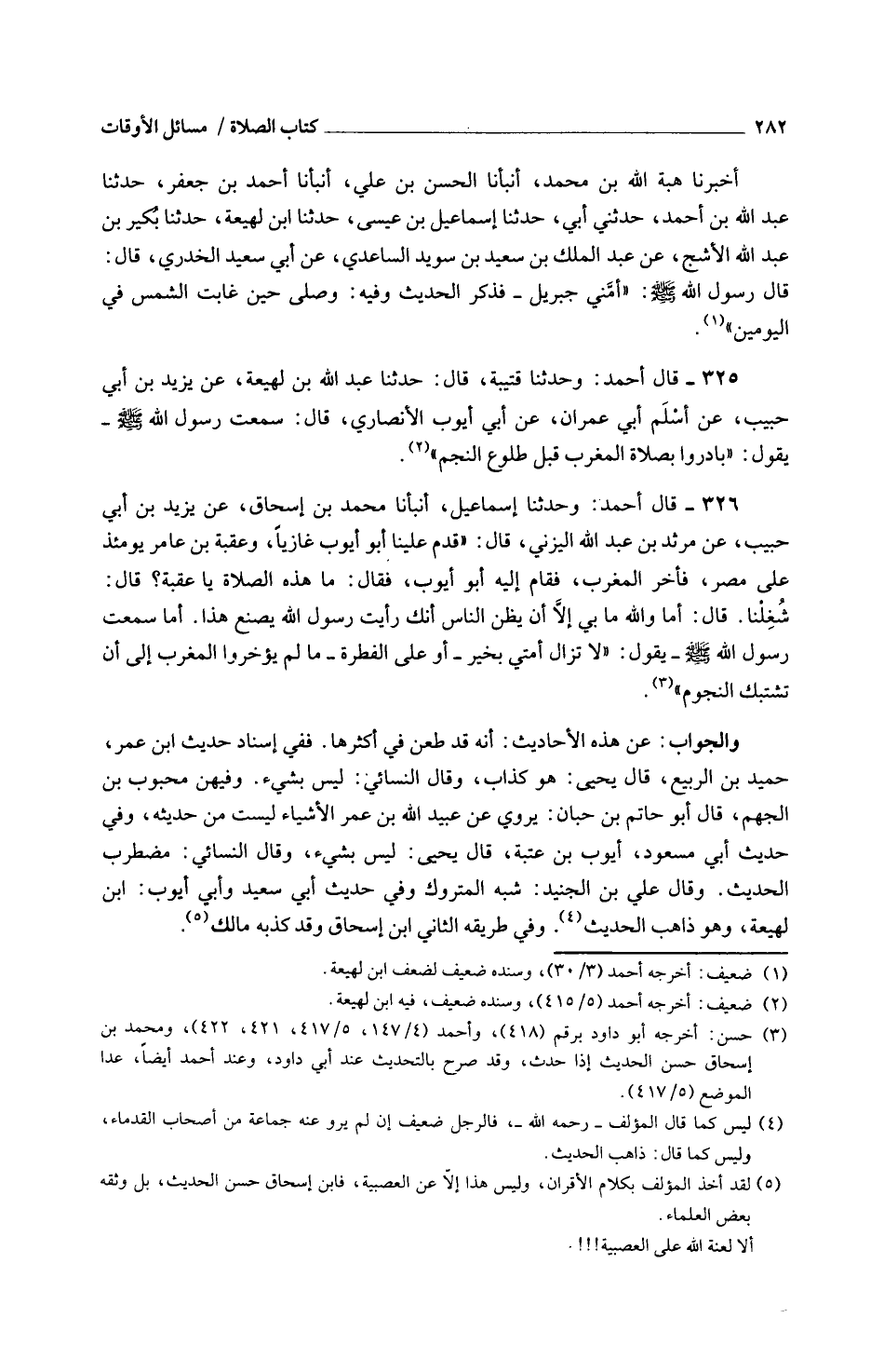 326 - قَالَ أَحْمَدُ وَحَدَّثَنَا إِسْمَاعِيلُ أَنْبَأَنَا مُحَمَّدُ بْنُ إِسْحَاقَ عَنْ يَزِيدَ بْنِ أَبِي حَبِيبٍ عَنْ مَرْثَدِ بْنِ عَبْدِ اللَّهِ الْيَزَنِيِّ قَالَ قَدِمَ عَلَيْنَا أَبُو أَيُّوبَ غَازِيًا وَعُقْبَةُ بْنُ عَامِرٍ يَوْمَئِذٍ عَلَى مِصْرَ فَأَخَّرَ الْمَغْرِبَ فَقَامَ إِلَيْهِ أَبُو أَيُّوبَ فَقَالَ مَا هَذِهِ الصَّلَاةُ يَا عُقْبَةُ قَالَ شُغِلْنَا قَالَ أَمَا وَاللَّهِ مَا بِي إِلَّا أَنْ يَظُنَّ النَّاسُ أَنَّكَ رَأَيْتَ رَسُولُ اللَّهِ صَلَّى اللَّهُ عَلَيْهِ وَسَلَّمَ يَصْنَعُ هَذَا أَمَا سَمِعْتَ رَسُولُ اللَّهِ صَلَّى اللَّهُ عَلَيْهِ وَسَلَّمَ يَقُولُ لَا تَزَالُ أُمَّتِي بِخَيْرٍ أَوْ عَلَى الْفِطْرَةِ مَا لَمْ يُؤَخِّرُوا الْمَغْرِبَ إِلَى أَنْ تشتبك النُّجُوم