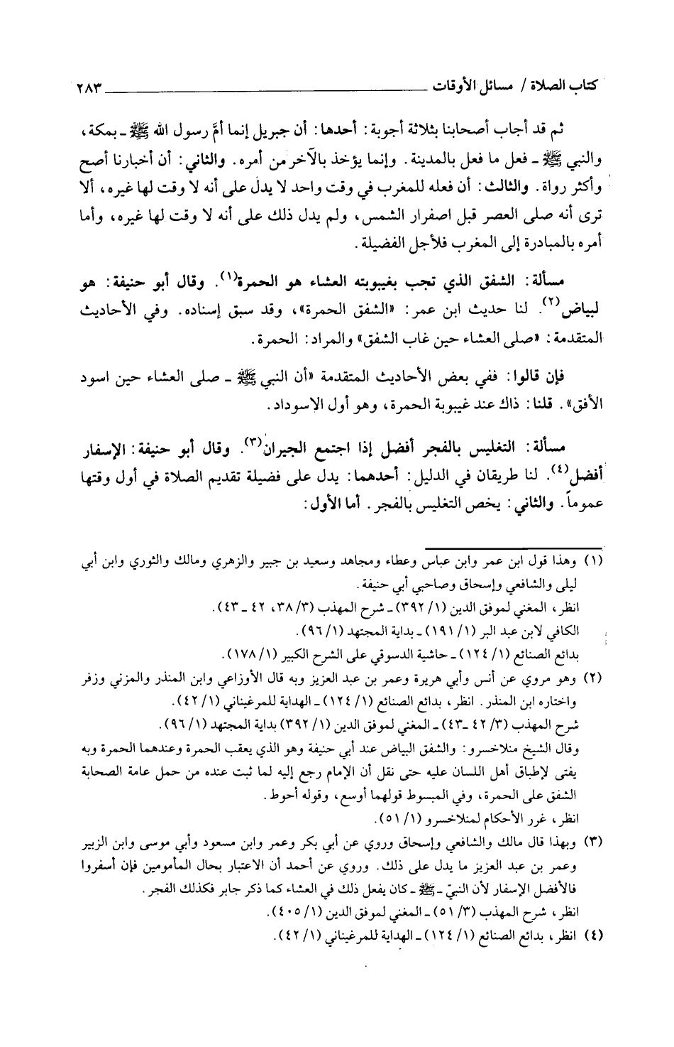 مَسْأَلَةٌ الشَّفَقُ الَّذِي تَجِبُ بِغَيْبُوبَتِهِ الْعِشَاءُ هُوَ الْحمرَة وقَالَ أَبُو حنيفَة هُوَ الْبيَاض لنا حَدِيثُ ابْنُ عُمَرَ الشَّفَقُ الْحُمْرَةُ وَقَدْ سَبَقَ إِسْنَادِهِ وَفِي الْأَحَادِيثِ الْمُتَقَدِّمَةُ صَلَّى الْعِشَاءَ حِينَ غَابَ الشَّفَقُ وَالْمُرَادُ الْحُمْرَةُ