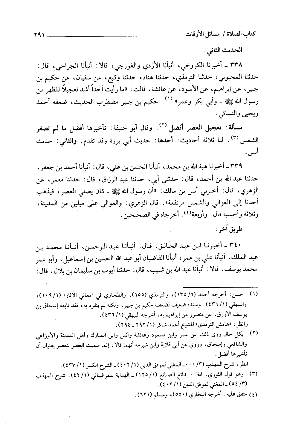 339 - أَخْبَرَنَا هِبَةُ اللَّهِ بْنُ مُحَمَّدٍ أَنْبَأَنَا الْحَسَنُ بْنُ عَلِيٍّ قَالَ أَنْبَأَنَا أَحْمَدُ بْنُ جَعْفَرٍ حَدَّثَنَا عَبْدُ اللَّهِ بْنُ أَحْمَدَ قَالَ حَدَّثَنِي أَبِي حَدَّثَنَا عَبْدُ الرَّزَاقِ قَالَ حَدَّثَنَا مَعْمَرٌ عَنِ الزُّهْرِيِّ قَالَ أَخْبَرَنِي أَنَسُ بْنِ مَالِكٍ أَنّ رَسُولَ اللَّهِ صَلَّى اللَّهُ عَلَيْهِ وَسَلَّمَ كَانَ يُصَلِّي الْعَصْرَ فَيَذْهَبُ أَحَدُنَا إِلَى الْعَوَالِي وَالشَّمْسُ مُرْتَفِعَةٌ قَالَ الزُّهْرِيُّ وَالْعَوَالِي عَلَى مِيلَيْنِ مِنَ الْمَدِينَةِ وَثَلَاثَةٍ وَأَحْسَبَهُ قَالَ وَأَرْبَعَةٍ أَخْرَجَاهُ فِي الصَّحِيحَيْنِ