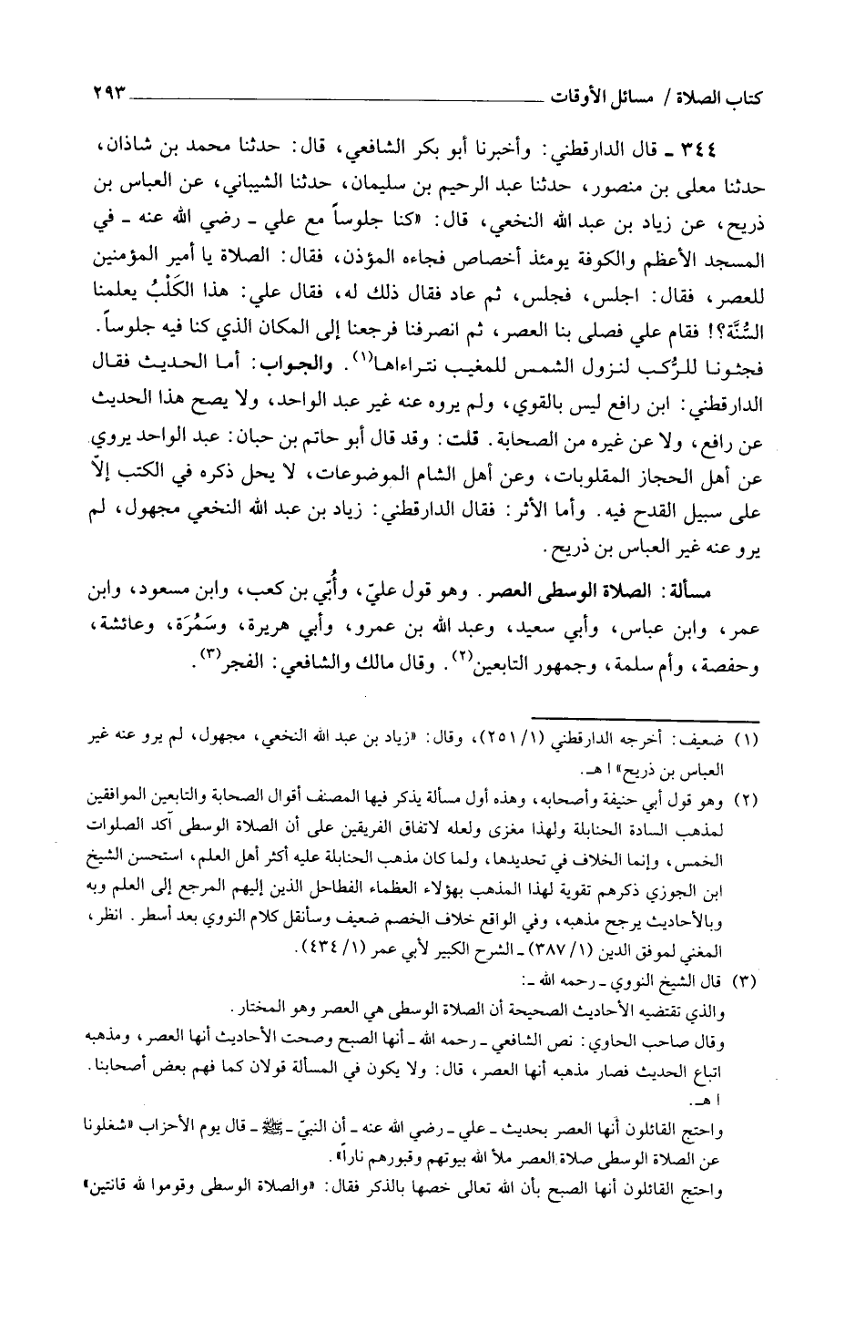 344 - قَالَ الدَّارَقُطْنِيُّ وَأَخْبَرَنَا أَبُو بَكْرٍ الشَّافِعِيُّ قَالَ حَدَّثَنَا مُحَمَّدُ بْنُ شَاذَانَ حَدَّثَنَا مُعَلَّى بْنُ مَنْصُورٍ حَدَّثَنَا عَبْدُ الرَّحِيمِ بْنُ سُلَيْمَانَ حَدَّثَنَا الشَّيْبَانِيُّ عَنِ الْعَبَّاسِ بْنِ ذَرِيحٍ عَنْ زِيَادِ بْنِ عَبْدِ اللَّهِ النَّخَعِيِّ قَالَ كُنَّا جُلُوسًا مَعَ عَلِيٍّ رَضِيَ اللَّهُ عَنْهُ فِي الْمَسْجِد الْأَعْظَم والْكُوفَة يَوْمَئِذٍ أَخْصَاصٌ فَجَاءَهُ الْمُؤَذِّنُ فَقَالَ الصَّلَاةَ يَا أَمِيرَ الْمُؤْمِنِينَ لِلْعَصْرِ فَقَالَ اجْلِسْ فَجَلَسَ ثُمَّ عَادَ فَقَالَ ذَلِكَ لَهُ فَقَالَ عَلِيُّ هَذَا الْكَلْب يعلمنَا السّنة فَقَامَ عَلِيٌّ فَصَلَّى بِنَا الْعَصْرَ ثُمَّ انْصَرَفْنَا فَرَجِعْنَا إِلَى الْمَكَانِ الَّذِي كُنَّا فِيهِ جُلُوسًا فَجَثَوْنَا لِلرُّكَبِ لِنُزُولِ الشَّمْسِ لِلْمَغِيبِ نَتَرَاءَاهَا وَالْجَوَابُ أَمَّا الْحَدِيثُ فَقَالَ الدَّارَقُطْنِيُّ ابْن رَافِعٍ لَيْسَ بِالْقَوِيِّ وَلَمْ يَرْوِهِ عَنْهُ غَيْرُ عَبْدِ الْوَاحِدِ وَلَا يَصِحُّ هَذَا الْحَدِيثُ عَنْ رَافِعٍ وَلَا عَنْ غَيْرِهِ مِنَ الصَّحَابَةِ قُلْتُ وَقَدْ قَالَ أَبُو حَاتِمِ بْنِ حِبَّانَ عَبْدُ الْوَاحِدِ يَرْوِي عَنْ أَهْلِ الْحِجَازِ الْمَقْلُوبَاتِ وَعَنْ أَهْلِ الشَّامِ الْمَوْضُوعَاتِ لَا يَحِلُّ ذِكْرَهُ فِي الْكُتُبِ إِلَّا عَلَى سَبِيل الْقدح فِيهِ وأما الْأَثَرُ فَقَالَ الدَّارَقُطْنِيُّ زِيَادُ بْنُ عَبْدِ اللَّهِ النَّخَعِيُّ مَجْهُولٌ لَمْ يَرْوِ عَنْهُ غَيْرُ الْعَبَّاسِ بْنُ ذَرِيحٍ