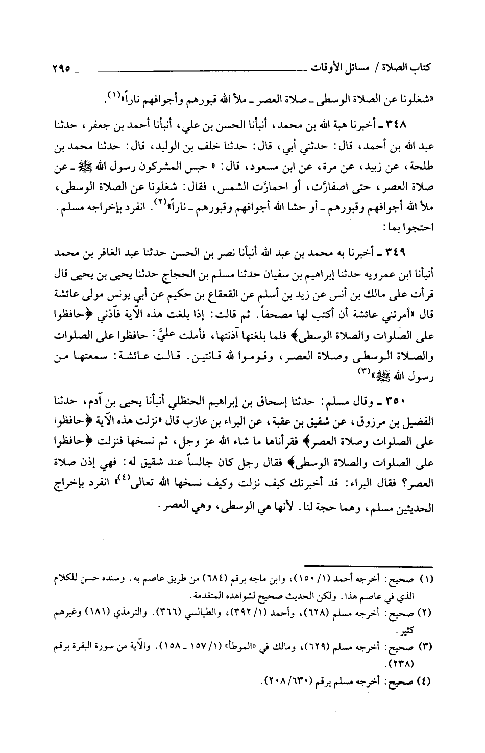 348 - أَخْبَرَنَا هِبَةُ اللَّهِ بْنُ مُحَمَّدٍ أَنْبَأَنَا الْحَسَنُ بْنُ عَلِيٍّ أَنْبَأَنَا أَحْمَدُ بْنُ جَعْفَرٍ حَدَّثَنَا عَبْدُ اللَّهِ بْنُ أَحْمَدَ قَالَ حَدَّثَنِي أَبِي قَالَ حَدَّثَنَا خَلَفُ بْنُ الْوَلِيدِ قَالَ حَدَّثَنَا مُحَمَّدُ بْنُ طَلْحَةَ عَنْ زُبَيْدٍ عَنْ مُرَّةَ عَنِ ابْنِ مَسْعُودٍ قَالَ حَبَسَ الْمُشْرِكُونَ رَسُولَ اللَّهِ صَلَّى اللَّهُ عَلَيْهِ وَسَلَّمَ عَنْ صَلَاةِ الْعَصْرِ حَتَّى اصْفَارَّتْ أَوِ احْمَارَّتِ الشَّمْسُ فَقَالَ شَغَلُونَا عَنِ الصَّلَاةِ الْوُسْطَى مَلَأَ اللَّهُ أَجْوَافَهُمْ وَقُبُورَهُمْ أَوْ حَشَا اللَّهُ أَجْوَافَهُمْ وَقُبُورَهُمْ نَارًا انْفَرَدَ بِإِخْرَاجِهِ مُسْلِمٌ احْتَجُّوا بِمَا