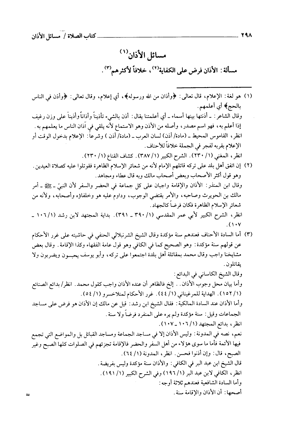 مَسْأَلَةٌ الْأَذَانُ فَرْضٌ عَلَى الْكِفَايَةِ خِلَافًا لِأَكْثَرِهِمْ