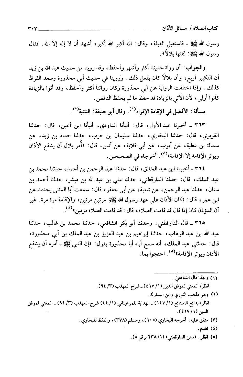 والْجَواب أَنَّ رَوَاةَ حَدِيثِنَا أَكْثَرُ وَأَشْهَرُ وَأَحْفَظُ وَقَدْ رَوَيْنَا مِنْ حَدِيثِ عَبْدِ اللَّهِ بْنِ زَيْدٍ أَنّ التَّكْبِيرَ أَرْبَعٌ وَأَنَّ بِلَالًا كَانَ يَفْعَلُ ذَلِكَ وَرَوَيْنَا فِي حَدِيثِ أَبِي مَحْذُورَةَ وَسَعْدٍ الْقَرَظِ كَذَلِكَ وَإِذَا اخْتَلَفَتِ الرِّوَايَةُ عَنْ أَبِي مَحْذُورَة وكَانَ رواتنا أَكثر وأحفظ وَقَدْ أَتَوْا بِالزِّيَادَةِ كَانُوا أَوْلَى لِأَنَّ الْآتِي بِالزِّيَادَةِ قَدْ حَفِظَ مَا لم يحفظ الناق صَلَّى اللَّهُ عَلَيْهِ وَسَلَّمَ مَسْأَلَةٌ الْأَفْضَلُ فِي الْإِقَامَةِ الْإِفْرَادُ وَقَالَ أَبُو حَنِيفَةَ التَّثْنِيَةُ