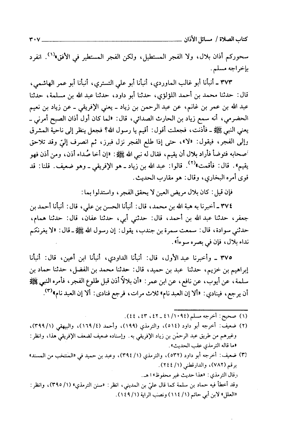 373 - أَنْبَأَنَا أَبُو غَالِبٍ الْمَاوَرْدِيُّ أَنْبَأَنَا أَبُو عَلِيٍّ التُّسْتَرِيُّ أَنْبَأَنَا أَبُو عُمَرَ الْهَاشِمِيُّ قَالَ حَدَّثَنَا مُحَمَّدُ بْنُ أَحْمَدَ اللُّؤلُؤيُّ حَدَّثَنَا أَبُو دَاوُدَ حَدَّثَنَا عَبْدُ اللَّهِ بْنُ مَسَلَمَةَ حَدَّثَنَا عَبْدُ اللَّهِ بْنُ عُمَرَ بْنِ غَانِمٍ عَنْ عَبْدِ الرَّحْمَنِ بْنِ زِيَادٍ يَعْنِي الْأَفْرِيقِيَّ عَنْ زِيَادِ بْنِ نُعَيْمٍ الْحَضْرَمِيِّ أَنَّهُ سَمِعَ زِيَادَ بْنَ الْحَارِثِ الصُّدَائِيَّ قَالَ لَمَّا كَانَ أَوَّلُ أَذَانِ الصُّبْحِ أَمَرَنِي يَعْنِي النَّبِيَّ صَلَّى اللَّهُ عَلَيْهِ وَسَلَّمَ فَأَذَّنْتُ فَجَعَلْتُ أَقُولُ أُقِيمُ يَا رَسُولَ اللَّهِ فَجَعَلَ يَنْظُرُ إِلَى نَاحِيَةِ الْمَشْرِقِ وَإِلَى الْفَجْرِ فَيَقُولُ لَا حَتَّى إِذَا طَلَعَ الْفَجْرُ نَزَلَ فَبَرَزَ ثُمَّ انْصَرَفَ إِلَيَّ وَقَدْ تَلَاحَقَ أَصْحَابُهُ فَتَوَضَّأَ فَأَرَادَ بِلَالٌ أَنْ يُقِيمَ فَقَالَ لَهُ نَبِيُّ اللَّهِ صَلَّى اللَّهُ عَلَيْهِ وَسَلَّمَ إِنَّ أَخَا صُدَاءٍ أَذَّنَ وَمَنْ أَذَّنَ فَهُوَ يُقِيمُ قَالَ فَأَقَمْتُ قَالُوا عَبْدُ اللَّهِ بْنُ زِيَادٍ هُوَ الْأَفْرِيقِيُّ وَهُوَ ضَعِيفٌ قُلْنَا قَدْ قَوَّى أَمْرَهُ الْبُخَارِيُّ وَقَالَ هُوَ مُقَارِبُ الْحَدِيثِ