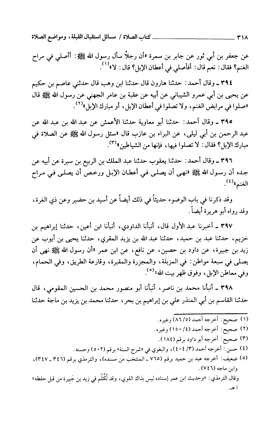 396 - وَقَالَ أَحْمُد حَدَّثَنَا يَعْقُوبُ حَدَّثَنَا عَبْدُ الْمَلِكِ بْنُ الرَّبِيعِ بْنِ سَبْرَةَ عَنْ أَبِيهِ عَنْ جَدِّهِ أَنّ رَسُولَ اللَّهِ صَلَّى اللَّهُ عَلَيْهِ وَسَلَّمَ نَهَى أَنْ يُصَلَّى فِي أَعْطَانِ الْإِبِلِ وَرَخَّصَ أَنْ يُصَلَّى فِي مُرَاحِ الْغَنَمِ