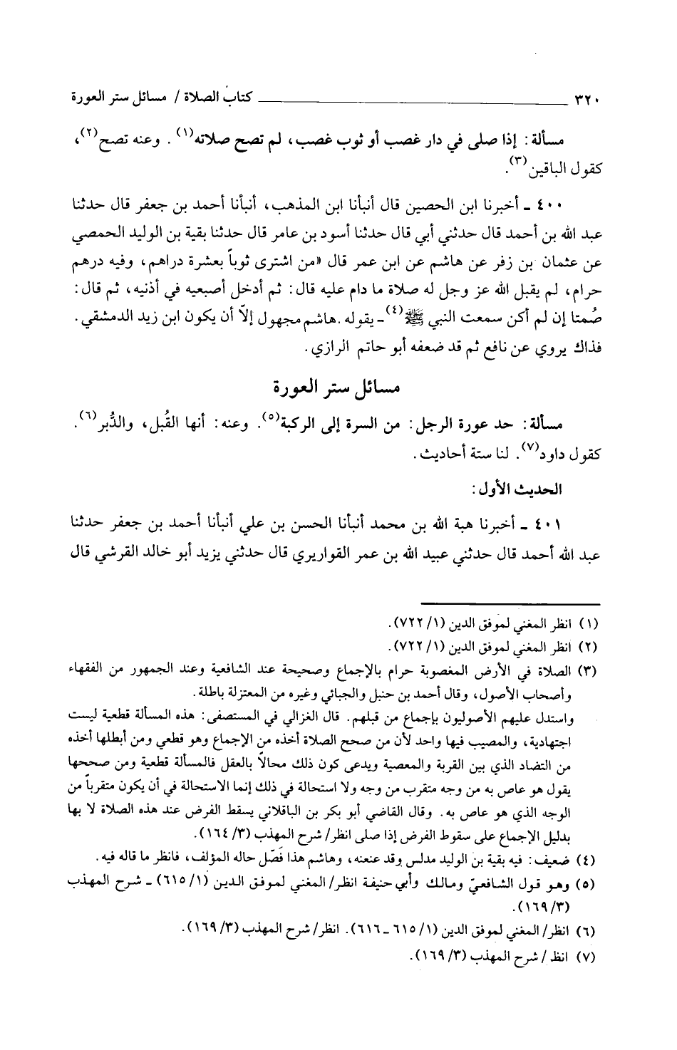 مَسْأَلَةٌ حَدُّ عَوْرَةِ الرَّجُلِ مِنَ السُّرَّةِ إِلَى الرُّكْبَةِ وَعَنْهُ أَنَّهَا الْقُبُلُ وَالدُّبُرُ كَقَوْلِ دَاوُدَ لَنَا سِتَّةُ أَحَادِيثَ
