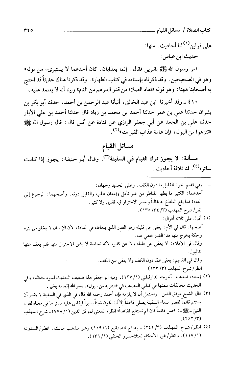 مَسْأَلَةٌ لَا يَجُوزُ تَرْكُ الْقِيَامِ فِي السَّفِينَةِ وَقَالَ أَبُو حَنِيفَةَ يَجُوزُ إِذَا كَانَتْ سَائِرَةً لَنَا ثَلَاثَةُ أَحَادِيثَ