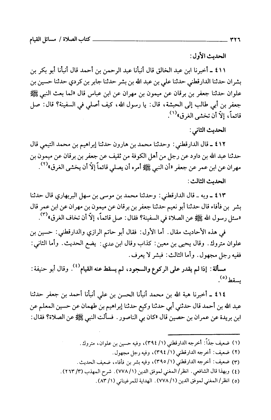 412 - قَالَ الدَّارَقُطْنِيُّ وَحَدَّثَنَا مُحَمَّدُ بْنُ هَارَونَ حَدَّثَنَا إِبْرَاهِيمُ بْنُ مُحَمَّدٍ التَّيْمِيُّ قَالَ حَدَّثَنَا عَبْدُ اللَّهِ بْنُ دَاوُدَ عَنْ رَجُلٍ مِنْ أَهْلِ الْكُوفَةِ مِنْ ثَقِيفٍ عَنْ جَعْفَرُ بْنُ بُرْقَانَ عَنْ مَيْمُونِ بْنِ مِهْرَانَ عَنِ ابْنِ عُمَرَ عَنْ جَعْفَرٍ أَنَّ النَّبِيَّ صَلَّى اللَّهُ عَلَيْهِ وَسَلَّمَ أَمَرَهُ أَنْ يُصَلِّي قَائِمًا إِلَّا أَنْ يَخْشَى الْغَرَقَ