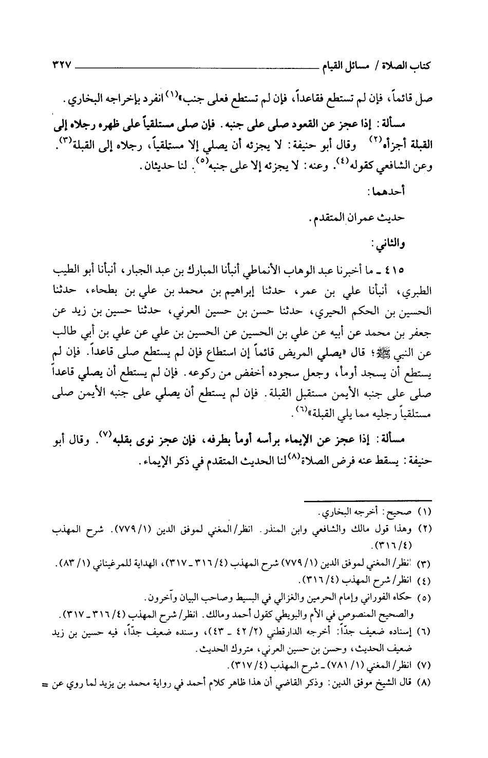 415 - مَا أَخْبَرَنَا عَبْدُ الْوَهَّابِ الْأَنْمَاطِيُّ أَنْبَأَنَا الْمُبَارَكُ بْنُ عَبْدِ الْجَبَّارِ أَنْبَأَنَا أَبُو الطَّيِّبِ الطَّبَرِيُّ أَنْبَأَنَا عَلِيُّ بْنُ عُمَرَ حَدَّثَنَا إِبْرَاهِيمُ بْنِ مُحَمَّدِ بْنِ عَلِيِّ بْنِ بَطْحَاءَ حَدَّثَنَا الْحُسَيْنُ بْنُ الْحَكَمِ الْحِيرِيُّ حَدَّثَنَا حَسَنُ بْنُ حُسَيْنٍ الْعُرَنِيُّ حَدَّثَنَا حُسَيْنُ بْنُ زَيْدٍ عَنْ جَعْفَرِ بْنِ مُحَمَّدٍ عَنْ أَبِيهِ عَنْ عَلِيِّ بْنِ الْحُسَيْنِ عَنِ الْحُسَيْنِ بْنِ عَلِيٍّ عَنْ عَلِيِّ بْنِ أَبِي طَالِبٍ عَنِ النَّبِيَّ صَلَّى اللَّهُ عَلَيْهِ وَسَلَّمَ قَالَ يُصَلِّي الْمَرِيضُ قَائِمًا إِنِ اسْتَطَاعَ فَإِنْ لَمْ يَسْتَطِعْ صَلَّى قَاعِدًا فَإِنْ لَمْ يَسْتَطِعْ أَنْ يَسْجُدَ أَوْمَأَ وَجَعَلَ سُجُودَهُ أَخْفَضَ مِنْ رُكُوعِهِ فَإِنْ لَمْ يَسْتَطِعْ أَنْ يُصَلِّي قَاعِدًا صَلَّى عَلَى جَنْبِهِ الْأَيْمَنِ مُسْتَقْبِلَ الْقِبْلَةِ فَإِنْ لَمْ يَسْتَطِعْ أَنْ يُصَلِّي عَلَى جَنْبِهِ الْأَيْمَنِ صَلَّى مُسْتَلْقِيًا رِجْلَيْهِ مِمَّا يَلِي الْقِبْلَةَ