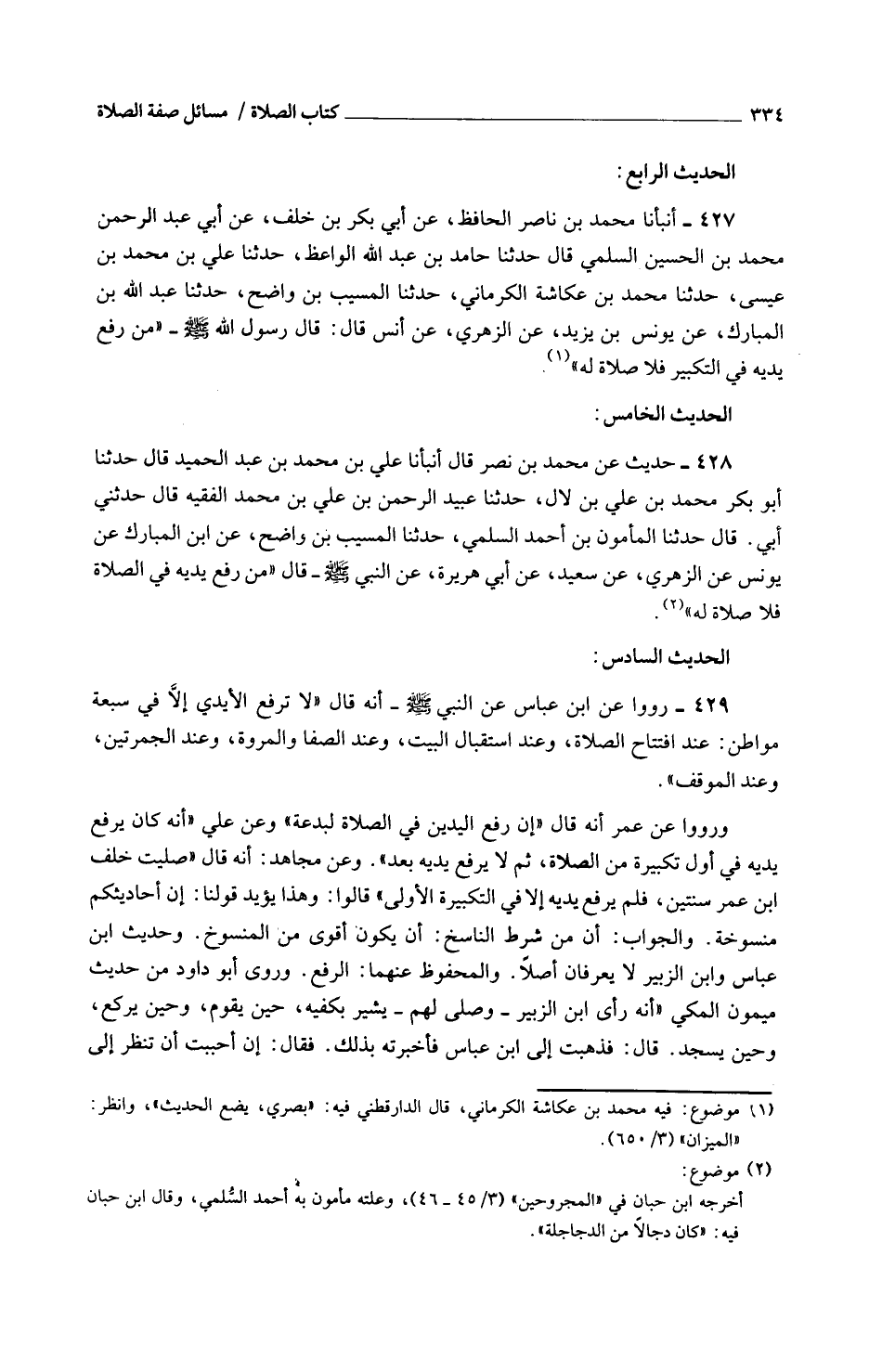 427 - أَنْبَأَنَا مُحَمَّدُ بْنُ نَاصِرٍ الْحَافِظُ عَنْ أَبِي بَكْرِ بْنِ خَلَفٍ عَنْ أَبِي عَبْدِ الرَّحْمَنِ مُحَمَّدِ بْنِ الْحُسَيْنِ السَّلَمِيِّ قَالَ حَدَّثَنَا حَامِدُ بْنُ عَبْدِ اللَّهِ الْوَاعِظُ حَدَّثَنَا عَلِيُّ بْنُ مُحَمَّدِ بْنِ عِيسَى حَدَّثَنَا مُحَمَّدُ بْنُ عُكَّاشَةَ الْكَرْمَانِيُّ حَدَّثَنَا الْمُسَيَّبُ بْنُ وَاضِحٍ حَدَّثَنَا عَبْدُ اللَّهِ بْنُ الْمُبَارَكِ عَنْ يُونُسَ بْنِ يَزِيدَ عَنِ الزُّهْرِيِّ عَنْ أَنَسٍ قَالَ قَالَ رَسُولُ اللَّهِ صَلَّى اللَّهُ عَلَيْهِ وَسَلَّمَ مَنْ رَفَعَ يَدَيْهِ فِي التَّكْبِيرِ فَلَا صَلَاةَ لَهُ