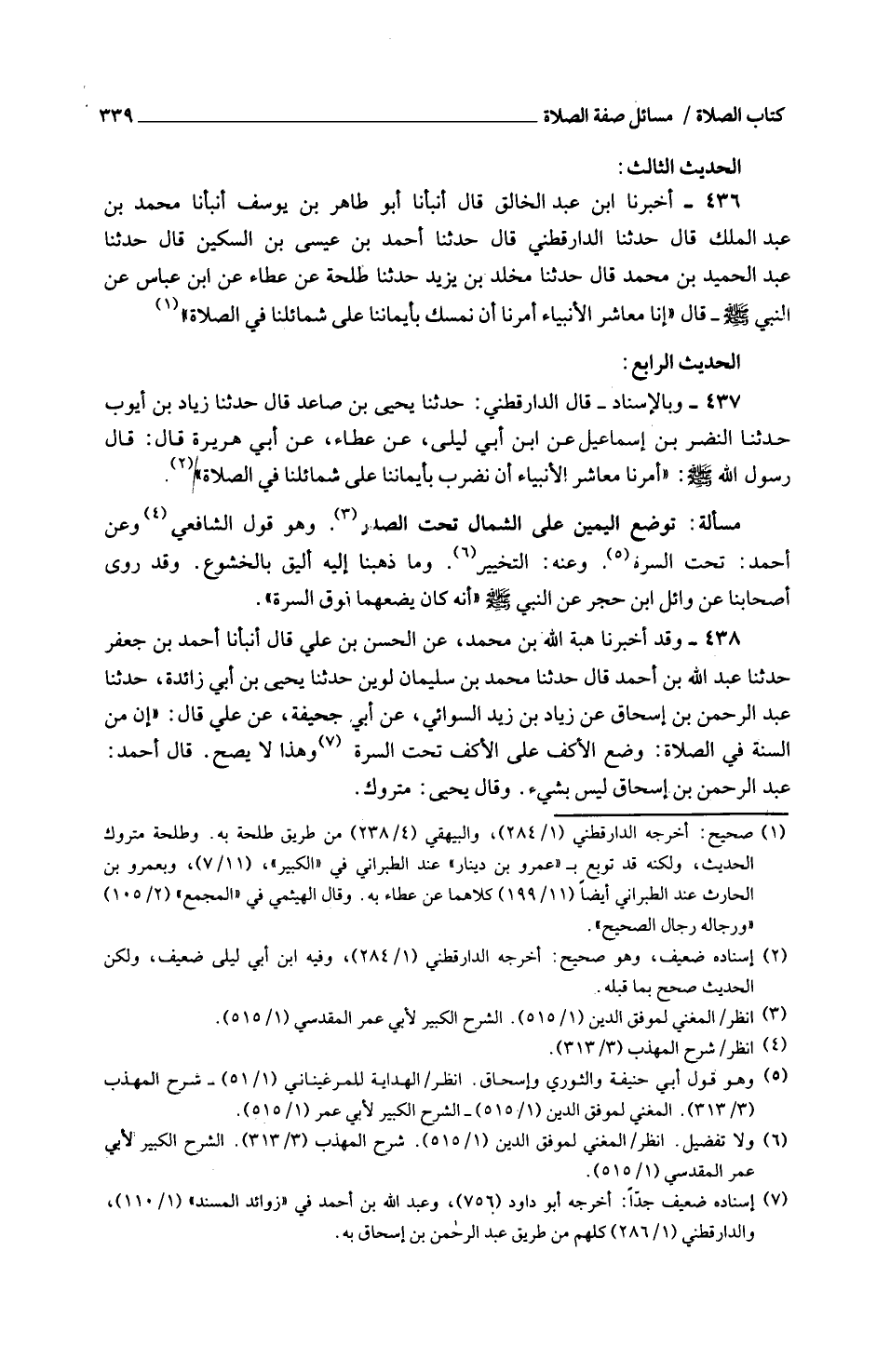 438 - وَقَدْ أَخْبَرَنَا هِبَةُ اللَّهِ بْنُ مُحَمَّدٍ عَنِ الْحَسَنِ بْنُ عَلِيٍّ قَالَ أَنْبَأَنَا أَحْمَدُ بْنُ جَعْفَرٍ حَدَّثَنَا عَبْدُ اللَّهِ بْنُ أَحْمَدَ قَالَ حَدَّثَنَا مُحَمَّدُ بْنُ سُلَيْمَانَ لُوَيْنٌ حَدَّثَنَا يَحْيَى بْنُ أَبِي زَائِدَةَ حَدَّثَنَا عَبْدُ الرَّحْمَنِ بْنُ إِسْحَاقَ عَنْ زِيَادِ بْنِ زَيْدٍ السُّوَائِيُّ عَنْ أَبِي جُحَيْفَةَ عَنْ عَلِيٍّ قَالَ إِنَّ مِنَ السُّنَّةِ فِي الصَّلَاةِ وَضْعَ الْأَكُفِّ عَلَى الْأَكُفِّ تَحْتَ السُّرَّةِ وَهَذَا لَا يَصِحُّ قَالَ أَحْمَدُ عَبْدُ الرَّحْمَنِ بْنُ إِسْحَاقَ لَيْسَ بِشَيْءٍ وَقَالَ يَحْيَى مَتْرُوكٌ