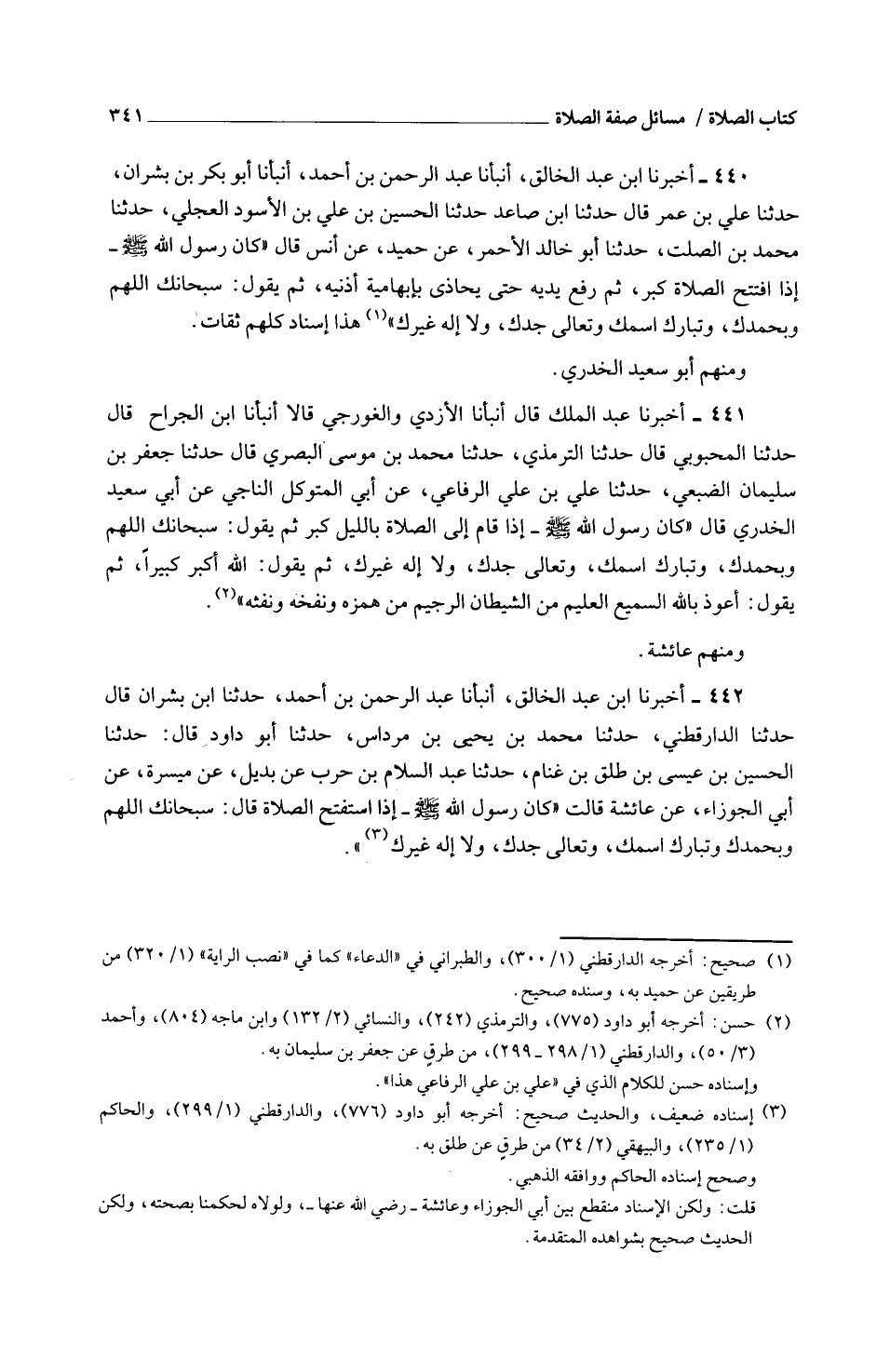 441 - أَخْبَرَنَا عَبْدُ الْمَلِكِ قَالَ أَنْبَأَنَا الْأَزْدِيُّ وَالْغُورَجِيُّ قَالَا أَنْبَأَنَا ابْنُ الْجَرَّاحِ قَالَ حَدَّثَنَا الْمَحْبُوبِيُّ قَالَ حَدَّثَنَا التِّرْمِذِيُّ حَدَّثَنَا مُحَمَّدُ بْنُ مُوسَى الْبَصْرِيُّ قَالَ حَدَّثَنَا جَعْفَرُ بْنُ سُلَيْمَانَ الضُّبَعِيُّ حَدَّثَنَا عَلِيُّ بْنُ عَلِيٍّ الرِّفَاعِيُّ عَنْ أَبِي الْمُتَوَكِّلِ النَّاجِيِّ عَنْ أَبِي سَعِيدٍ الْخُدْرِيِّ قَالَ كَانَ رَسُولُ اللَّهِ صَلَّى اللَّهُ عَلَيْهِ وَسَلَّمَ إِذَا قَامَ إِلَى الصَّلَاةِ بِاللَّيْلِ كَبَّرَ ثُمَّ يَقُولُ سُبْحَانَكَ اللَّهُمَّ وَبِحَمْدِكَ وَتَبَارَكَ اسْمك وَتَعَالَى جدك ولاإله غَيْرُكَ ثُمَّ يَقُولُ اللَّهُ أَكْبَرُ كَبِيرًا ثُمَّ يَقُولُ أَعُوذُ بِاللَّهِ السَّمِيعِ الْعَلِيمِ مِنَ الشَّيْطَانِ الرَّجِيمِ مِنْ هَمْزِهِ وَنَفْخِهِ وَنَفْثِهِ