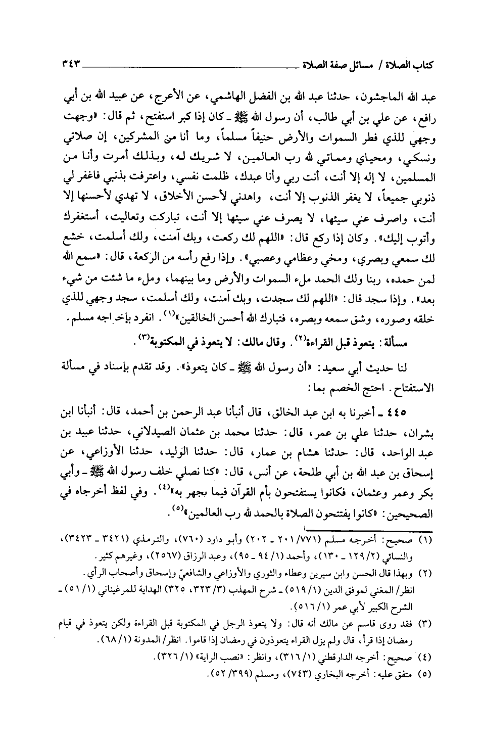 عَبْدِ اللَّهِ الْمَاجِشُونُ حَدَّثَنَا عَبْدُ اللَّهِ بْنُ الْفَضْلِ الْهَاشِمِيُّ عَنِ الْأَعْرَجِ عَنْ عُبَيْدِ اللَّهِ بْنِ أَبِي رَافِعٍ عَنْ عَلِيِّ بْنِ أَبِي طَالِبٍ أَنَّ رَسُولَ اللَّهِ صَلَّى اللَّهُ عَلَيْهِ وَسَلَّمَ كَانَ إِذَا كَبَّرَ اسْتَفْتَحَ ثُمَّ قَالَ وَجَّهْتُ وَجْهِي لِلَّذِي فَطَرَ السَّمَوَاتِ وَالْأَرْض حَنِيفا مُسلما ومَا أَنَا مِنَ الْمُشْرِكِينَ إِنَّ صَلَاتِي ونسكي ومحياي وَمَمَاتِي للَّهِ رَبِّ الْعَالَمِينَ لَا شريك لَهُ وبذلك أُمِرْتُ وَأَنَا مِنَ الْمُسْلِمِينَ لَا إِلَهَ إِلَّا أَنْتَ أَنْتَ رَبِّي وَأَنَا عَبْدُكَ ظَلَمْتُ نَفْسِي وَاعْتَرَفْتُ بِذَنْبِي فَاغْفِرْ لِي ذُنُوبِي جَمِيعًا لَا يَغْفِرُ الذُّنُوبَ إِلَّا أَنْتَ واهدني لأحسن الْأَخْلَاق لَا تهدي لِأَحْسَنِهَا إِلَّا أَنْتَ وَاصْرِفْ عَنِّي سَيِّئَهَا لَا يَصْرِفُ عَنِّي سَيِّئَهَا لَا إِلَّا أَنْت تَبَارَكت وتعاليت أستغفرك وأَتُوب إِلَيْكَ وَكَانَ إِذَا رَكَعَ قَالَ اللَّهُمَّ لَكَ رَكَعْتُ وَبِكَ آمَنْتُ وَلَكَ أَسْلَمْتُ خَشَعَ لَكَ سَمْعِي وَبَصَرِي وَمُخِّي وَعِظَامِي وَعَصَبِي وَإِذَا رَفَعَ رَأْسَهُ مِنَ الرَّكْعَةِ قَالَ سَمِعَ اللَّهِ لِمَنْ حَمِدَهُ رَبَّنَا وَلَكَ الْحَمْدُ مِلْءَ السَّمَوَاتِ وَالْأَرْضَ وَمَا بَنْيَهُمَا وَمِلْءَ مَا شِئْتَ من شَيْء بعد وإِذا سَجَدَ قَالَ اللَّهُمَّ لَكَ سَجَدْتُ وَبِكَ آمَنْتُ وَلَكَ أَسْلَمْتُ سَجَدَ وَجْهِي لِلَّذِي خَلَقَهُ وَصَوَّرَهُ وَشَقَّ سَمْعَهُ وَبَصَرَهُ فَتَبَارَكَ اللَّهُ أَحْسَنُ الْخَالِقِينَ انْفَرد بِإِخْرَاجِهِ مُسلم