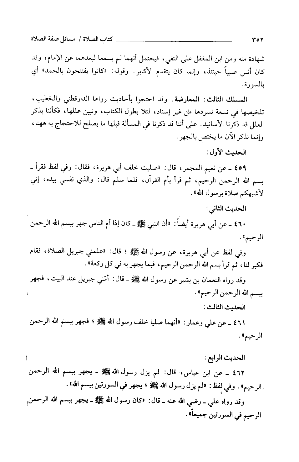 - الْمَسْلَكُ الثَّالِثُ الْمُعَارَضَةُ وَقَدِ احْتَجُّوا بِأَحَادِيثِ رَوَاهَا الدَّارَقطْنِيُّ وَالْخَطِيبُ تَلْخِيصُهَا فِي تِسْعَةِ نَسْرُدُهَا مِنْ غَيْرِ إِسْنَادٍ لِئَلا يَطُولُ الْكِتَابُ وَنُبَيِّنُ عِلَلِهَا فَكَأَنَّنَا بِذِكْرِ الْعِلَلَ قَدْ ذَكَرْنَا الْأَسَانِيدَ عَلَى أَنَّنَا قَدْ ذَكَرْنَا فِي الْمَسْأَلَةِ قَبْلِهَا مَا يَصْلُحُ للإحتجاج بِهِ هَهُنَا وَإِنَّمَا نَذْكُرُ الْآنَ مَا يَخْتَصُّ بِالْجَهْرِ