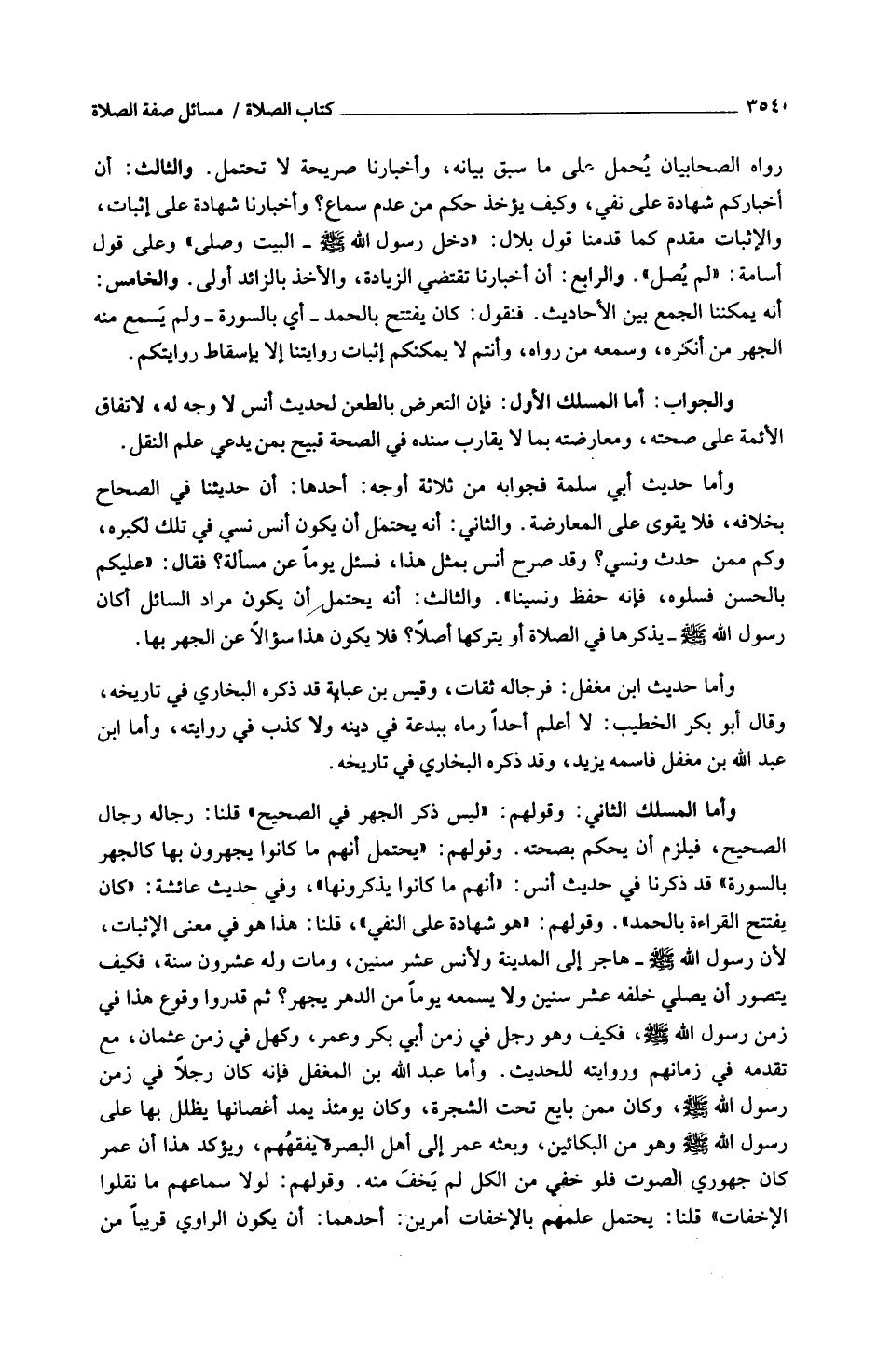 رَوَاهُ الصَّحَابِيَّانِ يُحْمَلُ عَلَى مَا سبق بَيَانه وأخبارنا صَرِيحَةٌ لَا تَحْتَمِلُ وَالثَّالِثُ أَنَّ أَخْبَارَكُمْ شَهَادَةٌ عَلَى نَفْيٍ وَكَيْفَ يُؤْخَذُ حُكْمٌ مِنْ عَدَمِ سَمَاعٍ وأخبارنا شَهَادَة على إِثْبَات والْإِثْبَات مُقَدَّمٌ كَمَا قَدَّمْنَا قَوْلَ بِلَالٍ دَخَلَ رَسُولُ اللَّهِ صَلَّى اللَّهُ عَلَيْهِ وَسلم الْبَيْت وَصلى وعَلى قَول أُسَامَة لم يصل و4 الرَّابِع أَن أخبارنا تَقْتَضِي الزِّيَادَة والْأَخْذ بِالزَّائِدِ أَوْلَى وَالْخَامِسُ أَنَّهُ يُمْكِنُنَا الْجَمْعُ بَيْنَ الْأَحَادِيثِ فَنَقُولُ كَانَ يَفْتَتِحُ بِالْحَمْدِ أَيْ بِالسُّورَةِ وَلَمْ يَسْمَعْ مِنْهُ الْجَهْرَ مَنْ أَنْكَرَهُ وسَمعه من رَوَاهُ وأَنْتُم لَا يُمْكِنُكُمْ إِثْبَاتُ رِوَايَتِنَا إِلَّا بِإِسْقَاطِ رِوَايَتِكُمْ