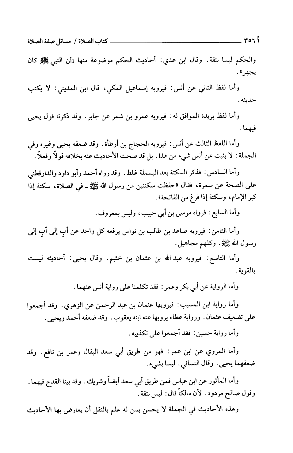 وأما الْمَرْوِيُّ عَنِ ابْنِ عُمَرَ فَهُوَ مِنْ طَرِيقِ أَبِي سَعْدٍ الْبَقَّالِ وَعُمَر بْنِ نَافِعٍ وَقَدْ ضَعَّفَهُمَا يَحْيَى وَقَالَ النَّسَائِيُّ لَيْسَا بِشَيْءٍ