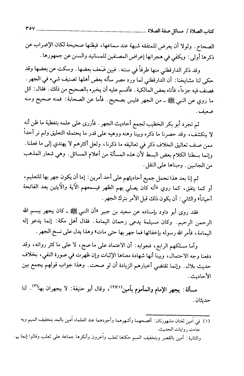 وَقَدْ ذَكَرَ الدَّارَقُطْنِيُّ مِنْهَا طَرَفًا فِي سُنَنِهِ فَبين ضعف بَعْضهَا وسكت عَنْ بَعْضُهَا وَقَدْ حَكَى لَنَا مَشَايِخُنَا أَنَّ الدَّارَقُطْنِيُّ لَمَّا وَرَدَ مِصْرَ سَأَلَهُ بَعْضُ أَهْلِهَا تَصْنِيفَ شَيْءٍ فِي الْجَهْرِ فَصَنَّفَ فِيهِ جُزْءًا فَأَتَاهُ بَعْضُ الْمَالَكِيَّةِ فَأَقْسَمَ عَلَيْهِ أَنْ يُخْبِرَهُ بِالصَّحِيحِ مِنْ ذَلِكَ فَقَالَ كُلُّ مَا رُوِيَ عَنِ النَّبِيِّ صَلَّى اللَّهُ عَلَيْهِ وَسَلَّمَ مِنَ الْجَهْرِ فَلَيْسَ بِصَحِيحٍ فَأَمَّا عَنِ الصَّحَابَةِ فَمِنْهُ صَحِيحٌ وَمِنْهُ ضَعِيفٌ