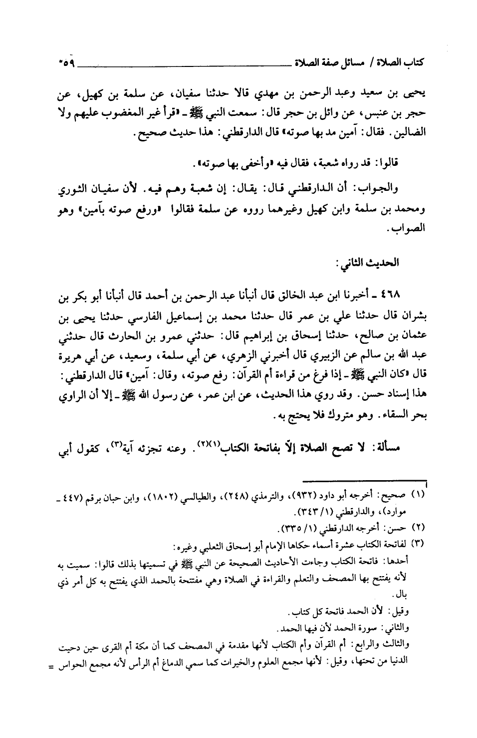 468 - أَخْبَرَنَا ابْنُ عَبْدِ الْخَالِقِ قَالَ أَنْبَأَنَا عَبْدُ الرَّحْمَنِ بْنُ أَحْمَدَ قَالَ أَنْبَأَنَا أَبُو بَكْرِ بْنِ بِشْرَانَ قَالَ حَدَّثَنَا عَلِيُّ بْنُ عُمَرَ قَالَ حَدَّثَنَا مُحَمَّدُ بْنُ إِسْمَاعِيلَ الْفَارِسِيُّ حَدَّثَنَا يَحْيَى بْنُ عُثْمَانَ بْنِ صَالِحٍ حَدَّثَنَا إِسْحَاقُ بْنُ إِبْرَاهِيمَ قَالَ حَدَّثَنِي عَمْرُو بْنُ الْحَارِثِ قَالَ حَدَّثَنِي عَبْدُ اللَّهِ بْنُ سَالِمٍ عَنِ الزبيرِي قَالَ أَخْبَرَنِي الزُّهْرِيُّ عَنْ أَبِي سَلَمَةَ وَسَعِيدٍ عَنْ أَبِي هُرَيْرَةَ قَالَ كَانَ النَّبِيُّ صَلَّى اللَّهُ عَلَيْهِ وَسَلَّمَ إِذَا فَرَغَ مِنْ قِرَاءَةِ أُمِّ الْقُرْآنِ رَفَعَ صَوْتَهُ وَقَالَ آمِينَ قَالَ الدَّارَقُطْنِيُّ هَذَا إِسْنَادٌ حَسَنٌ وَقَدْ رُوِيَ هَذَا الْحَدِيثُ عَنِ ابْنِ عُمَرَ عَنْ رَسُولُ اللَّهِ صَلَّى اللَّهُ عَلَيْهِ وَسَلَّمَ إِلَّا أَنَّ الرَّاوِي بَحْرٌ السقاء وهُوَ مَتْرُوكٌ فَلَا يُحْتَجُّ بِهِ