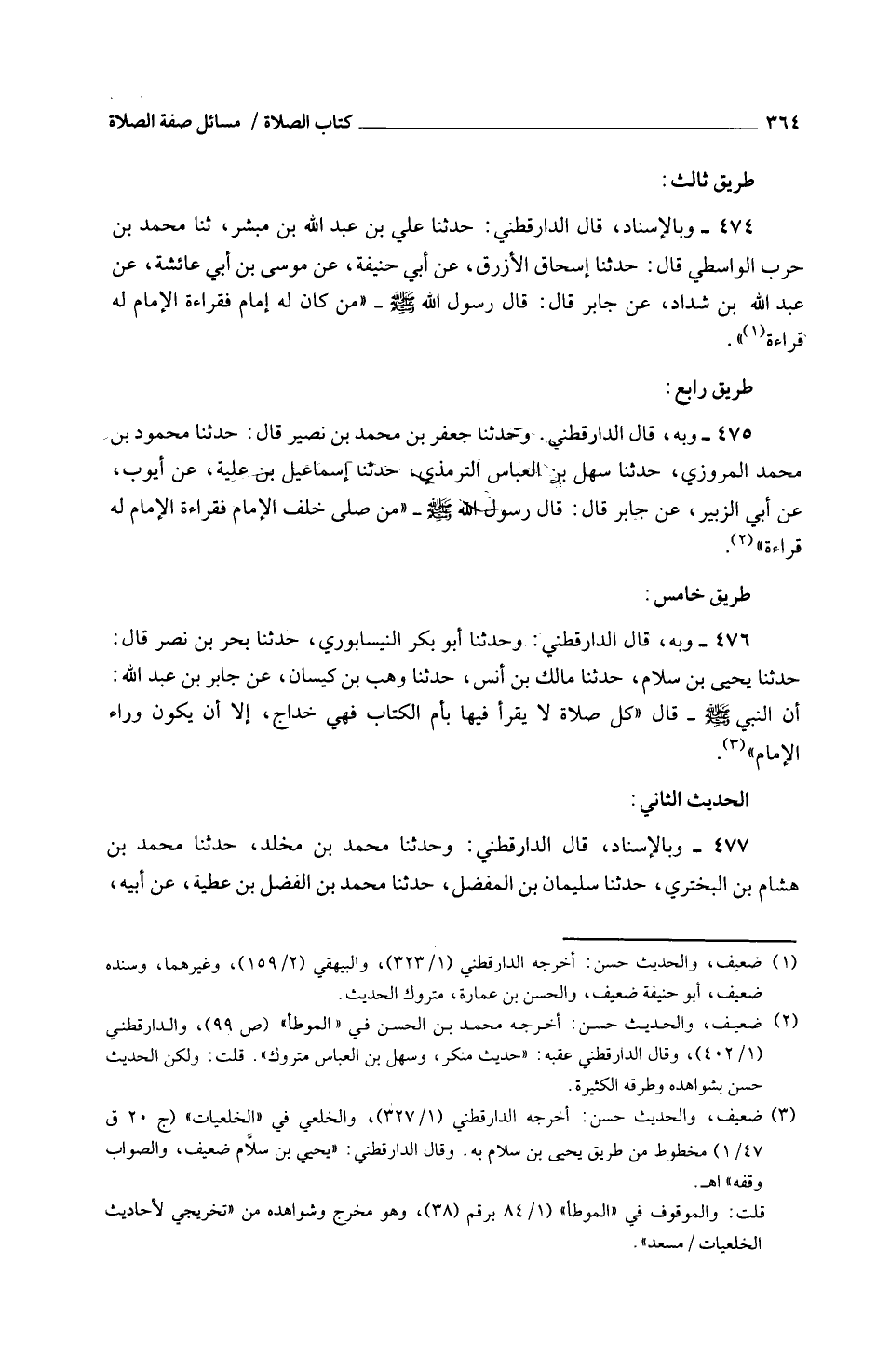 474 - وَبِالْإِسْنَادِ قَالَ الدَّارَقُطْنِيُّ حَدَّثَنَا عَلِيُّ بْنُ عَبْدِ اللَّهِ بن مُبشر ثَنَا مُحَمَّدُ بْنُ حَرْبٍ الْوَاسِطِيُّ قَالَ حَدَّثَنَا إِسْحَاقُ الْأَزْرَقُ عَنْ أَبِي حَنِيفَةَ عَنْ مُوسَى بْنِ أَبِي عَائِشَةَ عَنْ عَبْدِ اللَّهِ بْنِ شَدَّادِ عَنْ جَابِرٍ قَالَ قَالَ رَسُولُ اللَّهِ صَلَّى اللَّهُ عَلَيْهِ وَسَلَّمَ مَنْ كَانَ لَهُ إِمَامٌ فَقِرَاءَةُ الْإِمَامِ لَهُ قِرَاءَةٌ