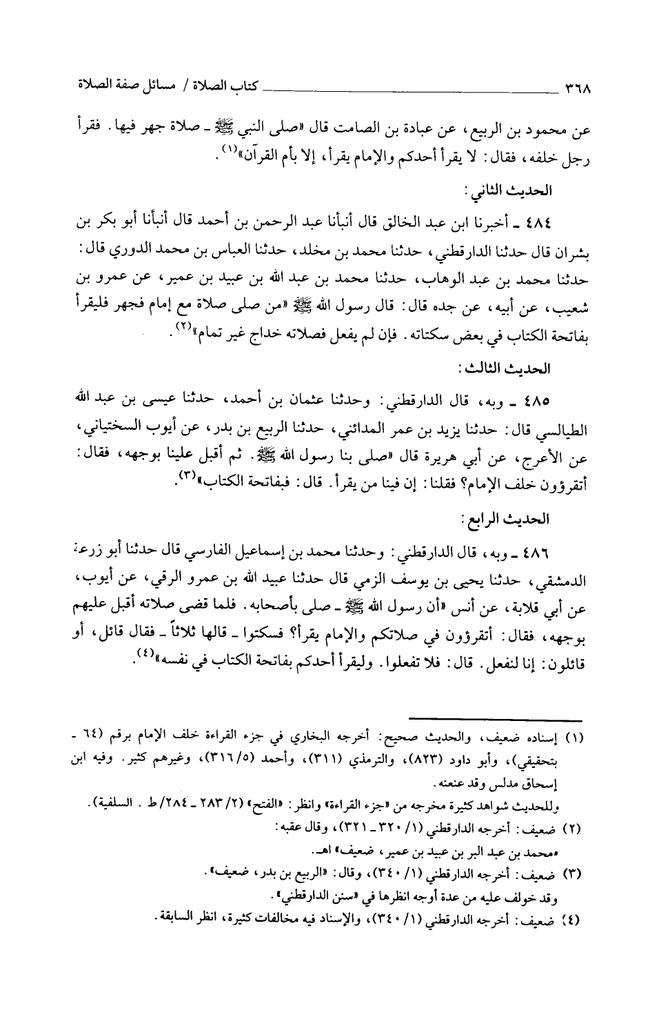 485 - وَبِهِ قَالَ الدَّارَقُطْنِيُّ وَحَدَّثَنا عُثْمَانُ بْنُ أَحْمَدَ حَدَّثَنَا عِيسَى بْنُ عَبْدِ اللَّهِ الطَّيَالِسِيُّ قَالَ حَدَّثَنَا يَزِيدُ بْنُ عُمَرَ المَدَائِنِيُّ حَدَّثَنَا الرَّبِيعُ بْنُ بَدْرٍ عَنْ أَيُّوبَ السِّخْتِيَانِيِّ عَنِ الْأَعْرَجِ عَنْ أَبِي هُرَيْرَةَ قَالَ صَلَّى بِنَا رَسُولُ اللَّهِ صَلَّى اللَّهُ عَلَيْهِ وَسَلَّمَ ثُمَّ أَقْبَلَ عَلَيْنَا بِوَجْهِهِ فَقَالَ أتقرأؤون خَلْفَ الْإِمَامِ فَقُلْنَا إِنَّ فِينَا مَنْ يَقْرَأُ قَالَ فَبِفَاتِحَةِ الْكِتَابِ