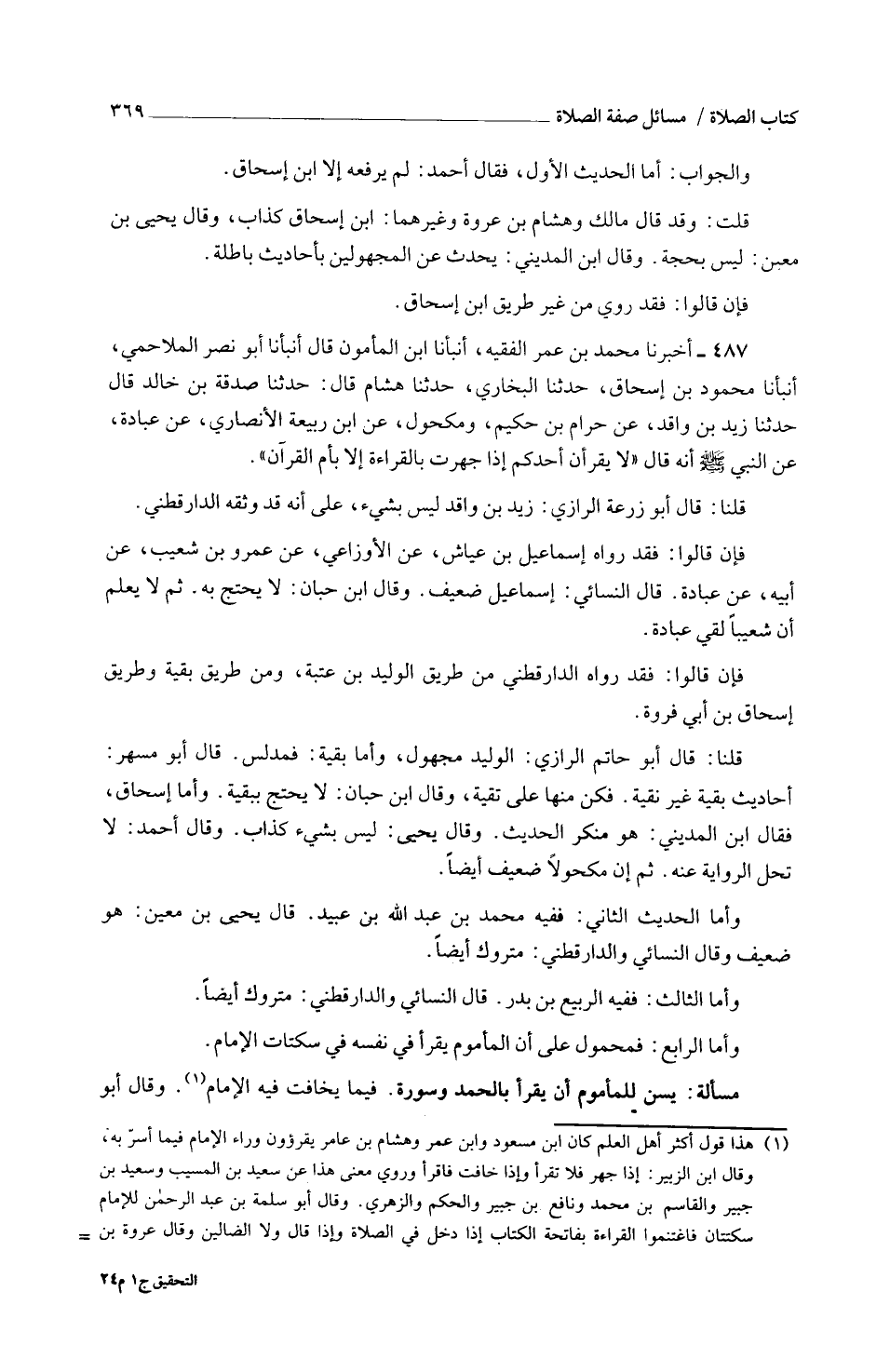 قُلْنَا قَالَ أَبُو حَاتِم الرَّازِيّ الْوَلِيد مَجْهُول وأما بَقِيَّةُ فَمُدَلِّسٌ قَالَ أَبُو مُسْهِرٍ أَحَادِيثُ بَقِيَّةَ غَيْرُ نَقَيَّةٍ فَكُنْ مِنْهَا عَلَى تَقِيَّةٍ وَقَالَ ابْنُ حبَان لَا يحْتَج بِبَقِيَّة وأما إِسْحَاقُ فَقَالَ ابْنُ الْمَدِينِيِّ هُوَ مُنْكَرُ الْحَدِيثِ وَقَالَ يَحْيَى لَيْسَ بِشَيْءٍ كَذَّابٌ وَقَالَ أَحْمَدُ لَا تَحِلُّ الرِّوَايَةُ عَنْهُ ثُمَّ إِنَّ مَكْحُولًا ضَعِيفٌ أَيْضًا