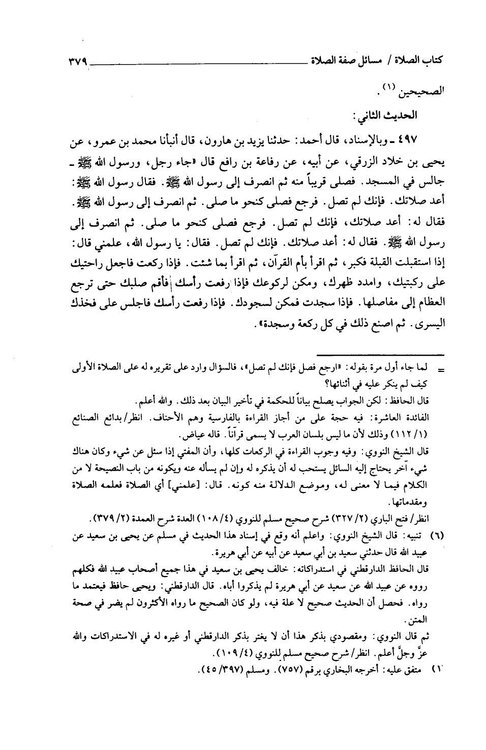 497 - وَبِالْإِسْنَادِ قَالَ أَحْمَدُ حَدَّثَنَا يَزِيدُ بْنُ هَارَونَ قَالَ أَنْبَأَنا مُحَمَّدُ بْنُ عَمْرٍو عَنْ يَحْيَى بْنِ خَلَّادٍ الزُّرْقِيُّ عَنْ أَبِيهِ عَنْ رِفَاعَةَ بْنِ رَافِعٍ قَالَ جَاءَ رَجُلٌ وَرَسُولُ اللَّهِ صَلَّى اللَّهُ عَلَيْهِ وَسَلَّمَ جَالِسٌ فِي الْمَسْجِدِ فَصَلَّى قَرِيبًا مِنْهُ ثُمَّ انْصَرَفَ إِلَى رَسُولِ اللَّهِ صَلَّى اللَّهُ عَلَيْهِ وَسَلَّمَ فَقَالَ رَسُولُ اللَّهِ صَلَّى اللَّهُ عَلَيْهِ وَسَلَّمَ أَعِدْ صَلَاتَكَ فَإِنَّكَ لَمْ تُصَلِّ فَرَجَعَ فَصَلَّى كَنَحْوِ مَا صَلَّى ثُمَّ انْصَرَفَ إِلَى رَسُولُ اللَّهِ صَلَّى اللَّهُ عَلَيْهِ وَسَلَّمَ فَقَالَ لَهُ أَعِدْ صَلَاتَكَ فَإِنَّكَ لَمْ تُصَلِّ فَرَجَعَ فَصَلَّى كَنَحْوِ مَا صَلَّى ثُمَّ انْصَرَفَ إِلَى رَسُولِ اللَّهِ صَلَّى اللَّهُ عَلَيْهِ وَسَلَّمَ فَقَالَ لَهُ أَعِدْ صَلَاتَكَ فَإِنَّكَ لَمْ تُصَلِّي فَقَالَ يَا رَسُولَ اللَّهِ عَلِّمْنِي قَالَ إِذَا اسْتَقْبَلْتَ الْقِبْلَةَ فَكَبِّرْ ثُمَّ اقْرَأْ بِأُمِّ الْقُرْآنِ ثُمَّ اقْرَأْ بِمَا شِئْتَ فَإِذَا رَكَعْتَ فَاجْعَلْ رَاحَتَيْكَ عَلَى رُكْبَتَيْكَ وَامْدُدْ ظَهْرَكَ وَمَكِّنْ لِرُكُوعِكَ فَإِذَا رَفَعْتَ رَأْسِكَ فَأَقِمْ صُلْبَكَ حَتَّى تَرْجِعَ الْعِظَامُ إِلَى مَفَاصِلِهَا فَإِذَا سَجَدْتَ فَمَكِّنْ لِسُجُودِكَ فَإِذَا رَفَعْتَ رَأْسِكَ فَاجْلِسْ عَلَى فَخِذِكَ الْيُسْرَى ثُمَّ اصْنَعْ ذَلِكَ فِي كُلِّ رَكْعَةٍ وَسَجْدَةٍ