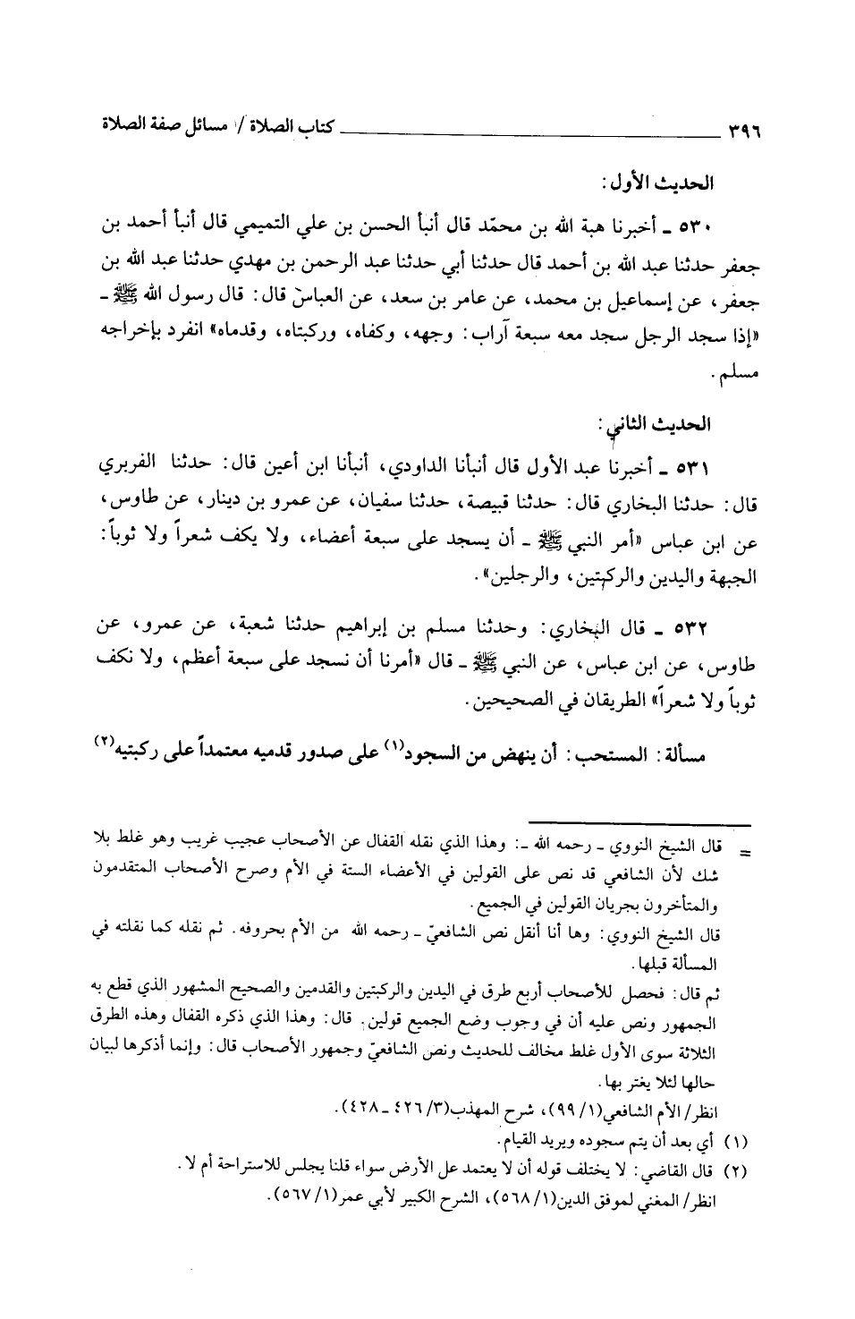 532 - قَالَ الْبُخَارِيُّ وَحَدَّثَنَا مُسْلِمُ بْنُ إِبْرَاهِيمَ حَدَّثَنَا شُعْبَةُ عَنْ عَمْرٍو عَنْ طَاوُسٍ عَنِ ابْنِ عَبَّاسٍ عَنِ النَّبِيِّ صَلَّى اللَّهُ عَلَيْهِ وَسَلَّمَ قَالَ أَمَرْنَا أَنْ نَسْجُدَ عَلَى سَبْعَةِ أَعْظُمٍ وَلَا نَكُفَّ ثَوْبًا وَلَا شَعْرًا الطَّرِيقَانِ فِي الصَّحِيحَيْنِ