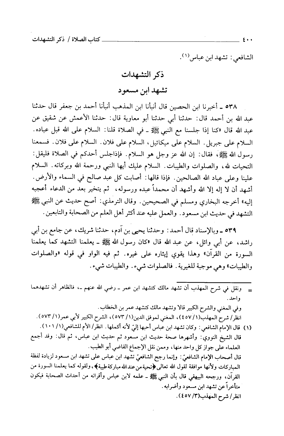 538 - أَخْبَرَنَا ابْنُ الْحُصَيْنِ قَالَ أَنْبَأَنَا ابْنُ الْمُذْهِبِ أَنْبَأَنَا أَحْمَدُ بْنُ جَعْفَرٍ قَالَ حَدَّثَنَا عَبْدُ اللَّهِ بْنُ أَحْمَدَ قَالَ حَدَّثَنَا أَبِي حَدَّثَنَا أَبُو مُعَاوِيَةَ قَالَ حَدَّثَنَا الْأَعْمَشُ عَنْ شَقِيقٍ عَنْ عَبْدِ اللَّهِ قَالَ كُنَّا إِذَا جَلَسْنَا مَعَ النَّبِيَّ صَلَّى اللَّهُ عَلَيْهِ وَسَلَّمَ فِي الصَّلَاةِ قُلْنَا السَّلَامُ عَلَى اللَّهِ قَبْلَ عِبَادِهِ السَّلَامُ عَلَى جِبْرِيلَ السَّلَامُ عَلَى مِيَكائِيلَ السَّلَامُ عَلَى فُلَانٍ السَّلَامُ عَلَى فُلَانٍ فَسَمِعْنَا رَسُولُ اللَّهِ صَلَّى اللَّهُ عَلَيْهِ وَسَلَّمَ فَقَالَ إِنَّ اللَّهَ عَزَّ وَجَلَّ هُوَ السَّلَامُ فَإِذَا جَلَسَ أَحَدُكُمْ فِي الصَّلَاةِ فَلْيَقُلْ التَّحِيَّاتُ للَّهِ وَالصَّلَوَاتُ وَالطَّيِّبَاتُ السَّلَامُ عَلَيْكَ أَيُّهَا النَّبِيُّ وَرَحْمَةُ اللَّهِ وَبَرَكَاتُهُ السَّلَامُ عَلَيْنَا وَعَلى عِبَادِ اللَّهِ الصَّالِحِينَ فَإِذَا قَالَهَا أَصَابَتْ كُلَّ عَبْدٍ صَالِحٍ فِي السَّمَاءِ وَالْأَرْض أشهد أَن لاإله إِلَّا اللَّهُ وَأَشْهَدُ أَنَّ مُحَمَّدًا عَبْدُهُ وَرَسُولُهُ ثُمَّ يَتَخَيَّرُ بَعْدُ من الدُّعَاء أعجبه إِلَيْهِ أَخْرَجَهُ الْبُخَارِيُّ وَمُسْلِمٌ فِي الصَّحِيحَيْنِ وَقَالَ التِّرْمِذِيُّ أَصَحُّ حَدِيثٍ عَنِ النَّبِيَّ صَلَّى اللَّهُ عَلَيْهِ وَسَلَّمَ التَّشَهُّد فِي حَدِيثُ ابْنِ مَسْعُودٍ وَالْعَمَلُ عَلَيْهِ عِنْدَ أَكْثَرِ أَهْلِ الْعِلْمِ مِنَ الصَّحَابَة والتَّابِعين