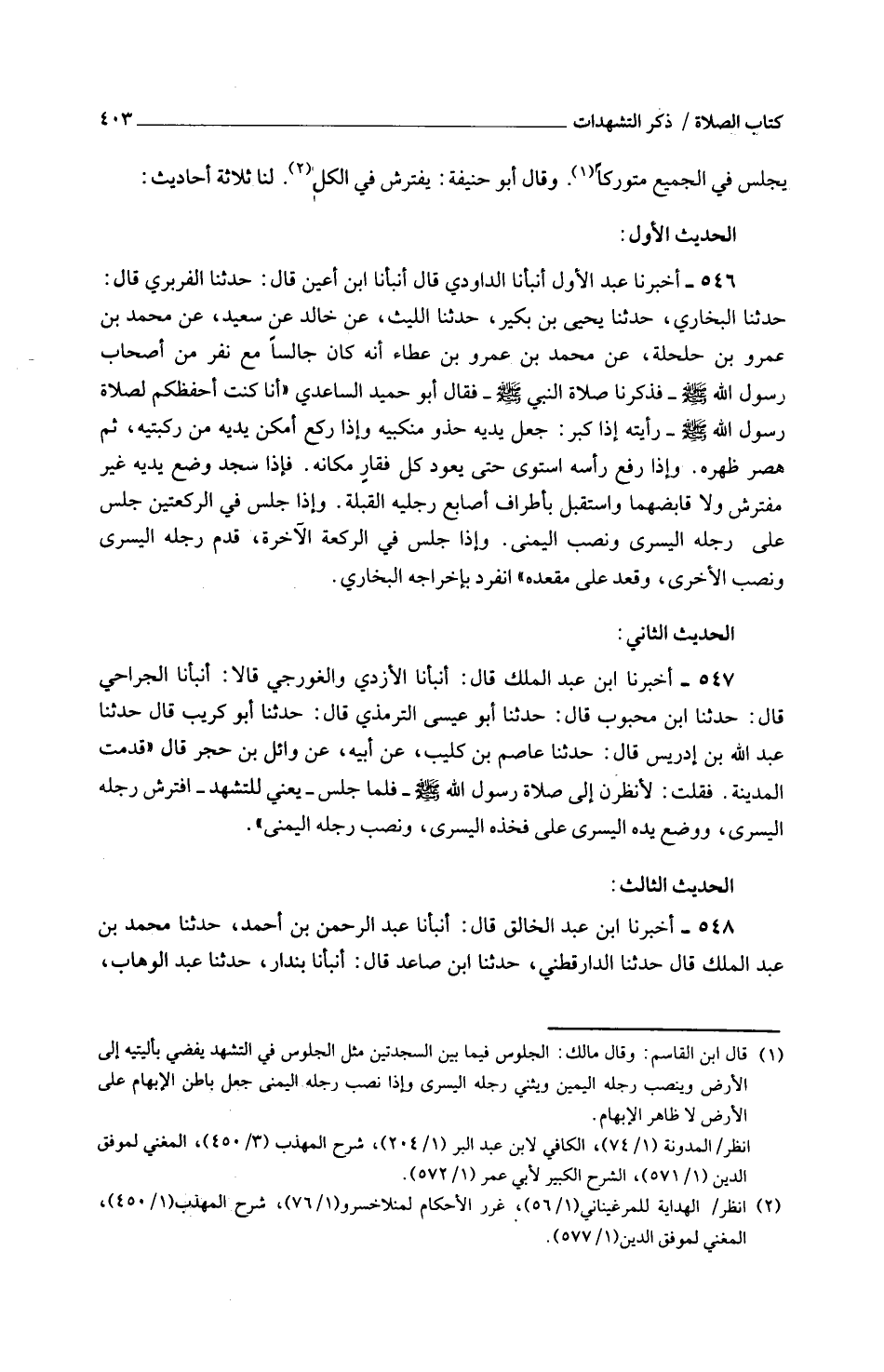 يَجْلِسُ فِي الْجَمِيعِ مُتَوَرِّكًا وَقَالَ أَبُو حَنِيفَةَ يَفْتَرِشُ فِي الْكُلِّ لَنَا ثَلَاثَةُ أَحَادِيثَ