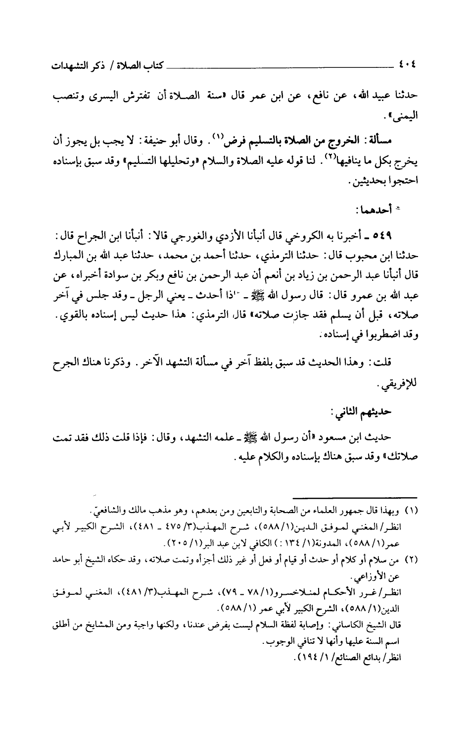 حَدِيثُ ابْنُ مَسْعُودٍ أَنَّ رَسُولُ اللَّهِ صَلَّى اللَّهُ عَلَيْهِ وَسَلَّمَ عَلَّمَهُ التَّشَهُّدَ وَقَالَ فَإِذَا قُلْتَ ذَلِكَ فَقَدْ تَمَّتْ صَلَاتُكَ وَقَدْ سَبَقَ هُنَاكَ بِإِسْنَادِهِ وَالْكَلَامُ عَلَيْهِ
