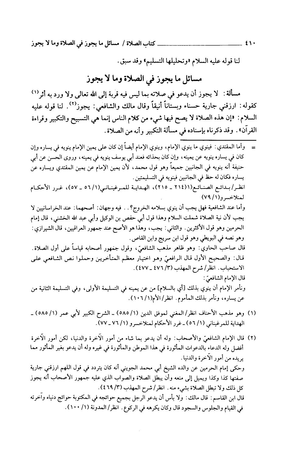 مَسْأَلَةٌ لَا يَجُوزُ أَنْ يَدْعُوَ فِي صَلَاتِهِ بِمَا لَيْسَ فِيهِ قُرْبَةٌ إِلَى اللَّهِ تَعَالَى وَلَا ورد بِهِ أثر كَقَوْلِهِ ارْزُقْنِي جَارَيَةً حَسْنَاءَ وَبُسْتَانًا أَنِيقًا وَقَالَ مَالِكٌ وَالشَّافِعِيُّ يَجُوزُ لَنَا قَوْلُهُ عَلَيْهِ السَّلَامُ إِنَّ هَذِه الصَّلَاة لَا يَصح فِيهَا شَيْءٌ مِنْ كَلَامِ النَّاسِ إِنَّمَا هِيَ التَّسْبِيحُ وَالتَّكْبِيرُ وَقِرَاءَةُ الْقُرْآنِ وَقَدْ ذَكَرْنَاهُ بِإِسْنَادِهِ فِي مَسْأَلَةِ التَّكْبِيرِ وَأَنَّهُ مِنَ الصَّلَاةِ