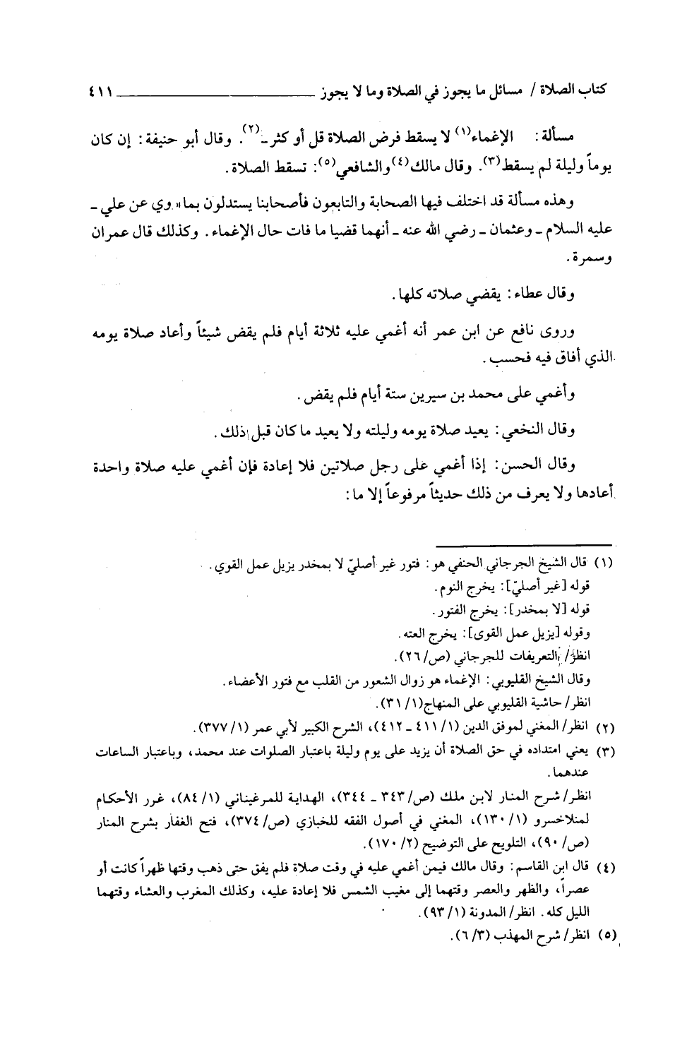 وَهَذِهِ مَسْأَلَةٌ قَدِ اخْتَلَفَ فِيهَا الصَّحَابَةُ وَالتَّابِعُونَ فَأَصْحَابُنَا يَسْتَدِلُّونَ بِمَا رُوِيَ عَنْ عَلِيٍّ عَلَيْهِ السَّلَام وَعُثْمَان رَضِيَ اللَّهُ عَنْهُ أَنَّهُمَا قَضَيَا مَا فَاتَ حَالَ الْإِغْمَاءِ وَكَذَلِكَ قَالَ عِمْرَانُ وَسَمُرَةُ