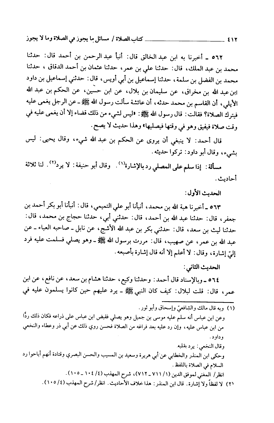 563 - أَخْبَرَنَا هِبَةُ اللَّهِ بْنُ مُحَمَّدٍ أَنْبَأَنَا أَبُو عَلِيٍّ التَّمِيمِيُّ قَالَ أَنْبَأَنَا أَبُو بَكْرٍ أَحْمَدُ بْنُ جَعْفَرٍ قَالَ حَدَّثَنَا عَبْدُ اللَّهِ بْنُ أَحْمَدَ قَالَ حَدَّثَنِي أَبِي حَدَّثَنَا حَجَّاجُ بْنُ مُحَمَّدٍ قَالَ حَدَّثَنَا لَيْثُ بْنُ سَعْدٍ قَالَ حَدَّثَنِي بكر بن عبد الله الْأَشَج عَن نابل صَاحبه الْعَبَاءِ عَنْ عَبْدِ اللَّهِ بْنِ عُمَرَ عَنْ صُهَيْبٍ قَالَ مَرَرْتُ بِرَسُولِ اللَّهِ صَلَّى اللَّهُ عَلَيْهِ وَسَلَّمَ وَهُوَ يُصَلِّي فَسَلَّمْتُ عَلَيْهِ فَرَدَّ إِلَيَّ إِشَارَةً وقَالَ لَا أَعْلَمُ إِلَّا أَنَّهُ قَالَ إِشَارَةً بِأَصْبُعِهِ