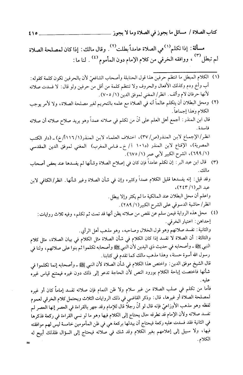 مَسْأَلَةٌ إِذَا تَكَلَّمَ فِي الصَّلَاةِ عَامِدًا بطلت وقَالَ مَالِكٌ إِذَا كَانَ لِمَصْلَحَةِ الصَّلَاةِ لَمْ تَبْطُلْ وَوَافَقَهُ الْخَرَقِيُّ مِنْ كَلَامِ الْإِمَامِ دُونَ الْمَأْمُومِ لَنَا مَا