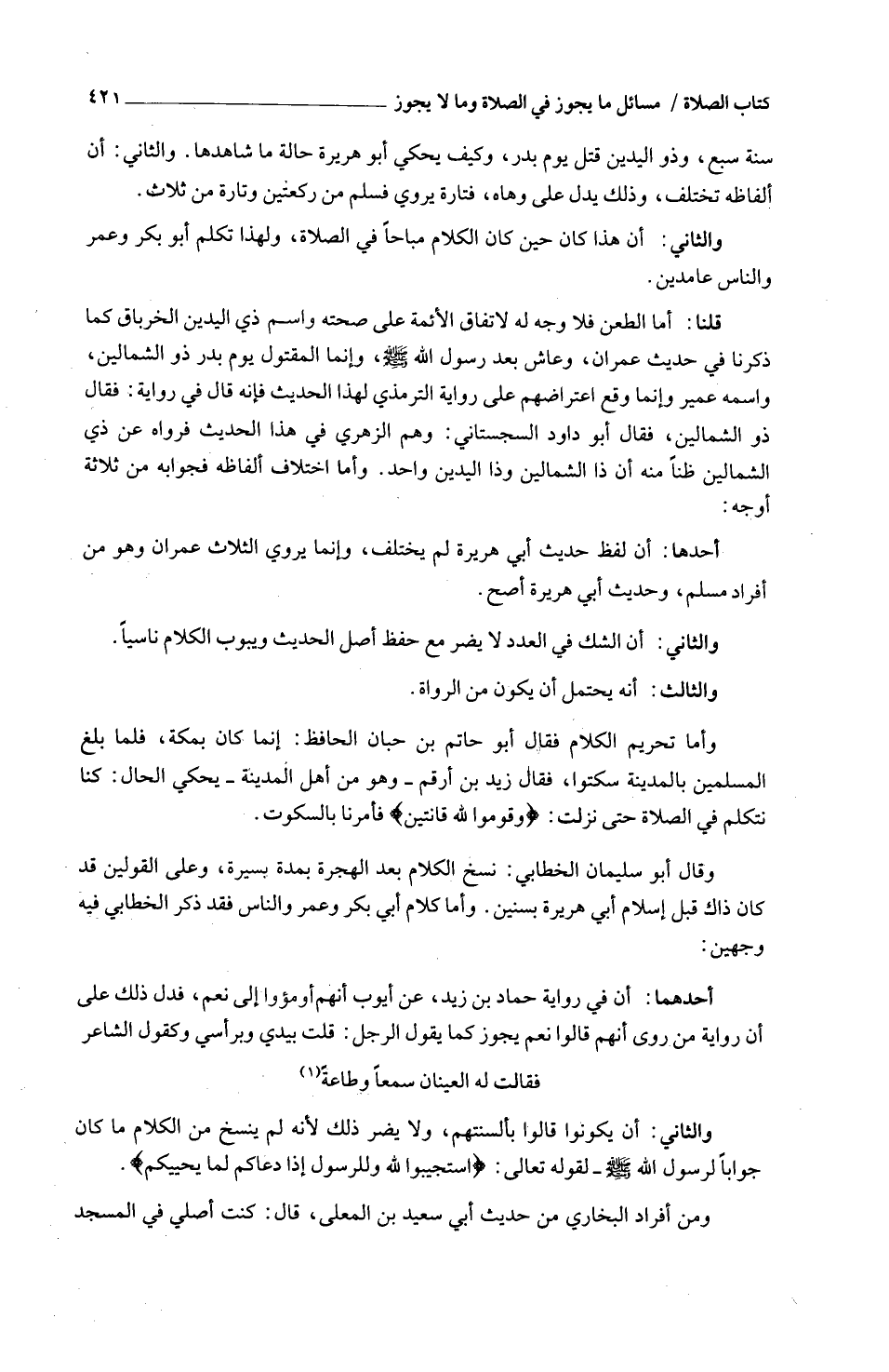 قُلْنَا أَمَّا الطَّعْنُ فَلَا وَجْهَ لَهُ لِاتِّفَاقِ الْأَئِمَّةِ عَلَى صِحَّته واسْم ذِي الْيَدَيْنِ الْخِرْبَاقُ كَمَا ذَكَرْنَا فِي حَدِيثِ عِمْرَانَ وَعَاشَ بَعْدَ رَسُولُ اللَّهِ صَلَّى اللَّهُ عَلَيْهِ وَسَلَّمَ وَإِنَّمَا الْمَقْتُولُ يَوْمَ بَدْرٍ ذُو الشمالين واسْمه عُمَيْر وإِنَّمَا وَقع اعتراضهم على رِوَايَة التِّرْمِذِيّ لِهَذَا الْحَدِيثِ فَإِنَّهُ قَالَ فِي رِوَايَة فَقَالَ ذُو الشِّمَالَيْنِ فَقَالَ أَبُو دَاوُدَ السِّجِسْتَانِيُّ وَهِمَ الزُّهْرِيُّ فِي هَذَا الْحَدِيثِ فَرَوَاهُ عَنْ ذِي الشِّمَالَيْنِ ظَنًّا مِنْهُ أَنَّ ذَا الشمالين وَذَا الْيَدَيْنِ وَاحِد وأما اخْتِلَافُ أَلْفَاظِهِ فَجَوَابُهُ مِنْ ثَلَاثَةِ أَوْجُهٍ