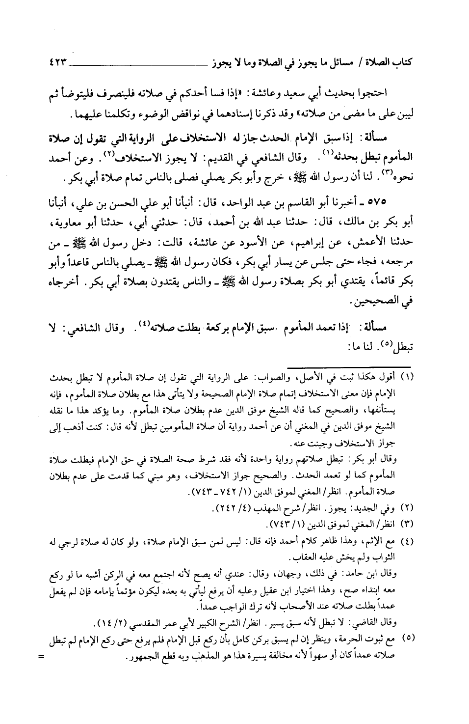 مَسْأَلَةٌ إِذَا سَبَقَ الْإِمَامَ الْحَدث أجَاز لَهُ الِاسْتِخْلَافُ عَلَى الرِّوَايَةِ الَّتِي تَقُولُ إِنَّ صَلَاةَ الْمَأْمُومِ تَبْطُلُ بِحَدَثِهِ وَقَالَ الشَّافِعِيُّ فِي الْقَدِيمِ لَا يجوز الِاسْتِخْلَاف وعَن أَحْمَدَ نَحْوُهُ لَنَا أَنَّ رَسُولَ اللَّهِ صَلَّى اللَّهُ عَلَيْهِ وَسَلَّمَ خرج وأَبُو بَكْرٍ يُصَلِّي فَصَلَّى بِالنَّاسِ تَمَامَ صَلَاةِ أَبِي بَكْرٍ