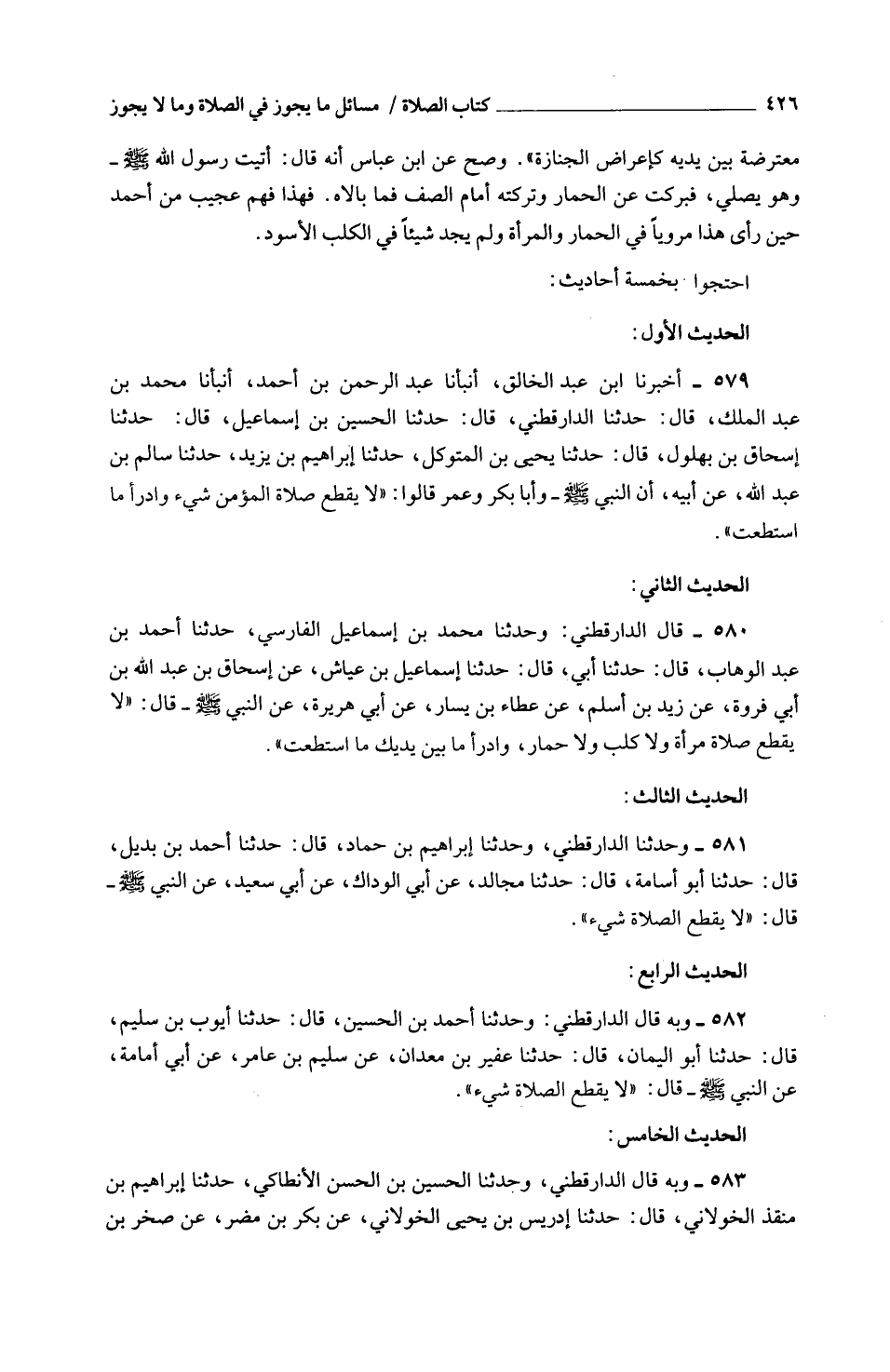 581 - وحَدثنَا الدَّارَقُطْنِيّ وحَدثنَا إِبْرَاهِيمُ بْنُ حَمَّادٍ قَالَ حَدَّثَنَا أَحْمَدُ بْنُ بُدَيْلٍ قَالَ حَدَّثَنَا أَبُو أُسَامَةَ قَالَ حَدَّثَنَا مُجَالِدٌ عَنْ أَبِي الْوَدَّاكِ عَنْ أَبِي سَعِيدٍ عَنِ النَّبِيِّ صَلَّى اللَّهُ عَلَيْهِ وَسَلَّمَ قَالَ لَا يَقْطَعُ الصَّلَاةَ شَيْءٌ