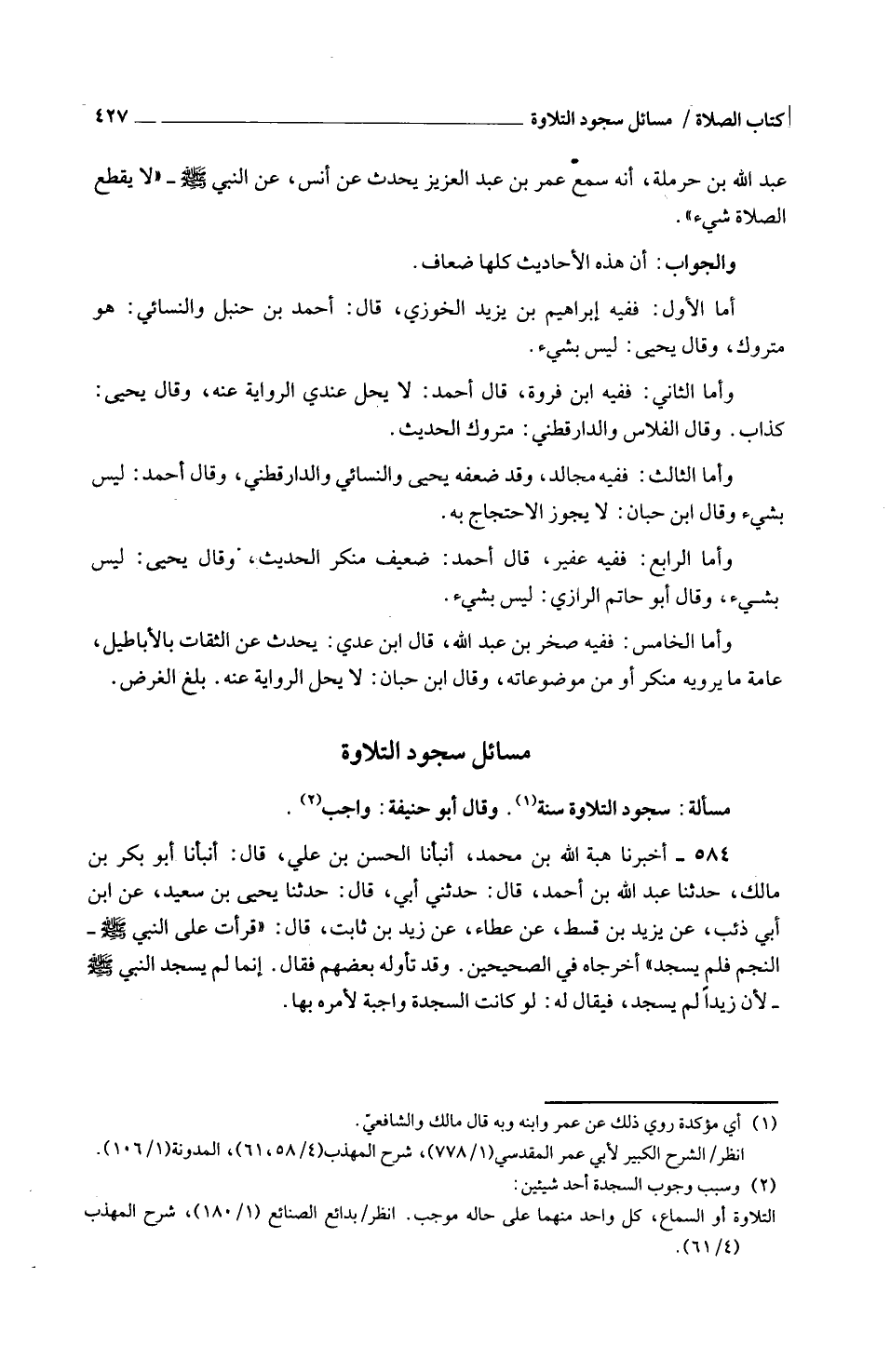 584 - أَخْبَرَنَا هِبَةُ اللَّهِ بْنُ مُحَمَّدٍ أَنْبَأَنَا الْحَسَنُ بْنُ عَلِيٍّ قَالَ أَنْبَأَنَا أَبُو بَكْرِ بْنُ مَالِكٍ حَدَّثَنَا عَبْدُ اللَّهِ بْنُ أَحْمَدَ قَالَ حَدَّثَنِي أَبِي قَالَ حَدَّثَنَا يَحْيَى بْنُ سَعِيدٍ عَنْ ابْنِ أَبِي ذِئْبٍ عَنْ يَزِيدَ بن قسط عَنْ عَطَاءٍ عَنْ زَيْدِ بْنِ ثَابِتٍ قَالَ قَرَأْتُ عَلَى النَّبِيِّ صَلَّى اللَّهُ عَلَيْهِ وَسَلَّمَ النَّجْمَ فَلَمْ يَسْجُدْ أَخْرَجَاهُ فِي الصَّحِيحَيْنِ وَقَدْ تَأَوَّلَهُ بَعْضُهُمْ فَقَالَ إِنَّمَا لَمْ يَسْجُدِ النَّبِيُّ صَلَّى اللَّهُ عَلَيْهِ وَسَلَّمَ لِأَنَّ زَيْدًا لَمْ يَسْجُدْ فَيُقَالُ لَهُ لَوْ كَانَتِ السَّجْدَةُ وَاجِبَةً لَأَمَرَهُ بِهَا
