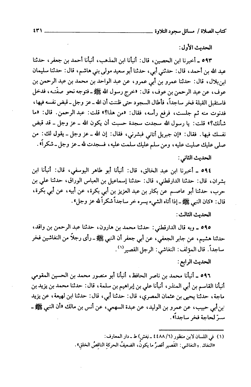595 - وَبِهِ قَالَ الدَّارَقُطْنِيُّ حَدَّثَنَا مُحَمَّدُ بْنُ هَارُونَ حَدَّثَنَا عَبْدُ الرَّحْمَنِ بْنُ وَاقِدٍ حَدَّثَنَا هُشَيْمٌ عَنْ جَابِرٍ الْجُعْفِيِّ عَنْ أَبِي جَعْفَرٍ أَنَّ النَّبِيَّ صَلَّى اللَّهُ عَلَيْهِ وَسَلَّمَ رَأَى رَجُلًا مِنَ النَّغَّاشِينَ فَخَرَّ سَاجِدًا قَالَ الْمُؤَلِّفُ النَّغَّاشِيُّ الرَّجُلُ الْقَصِيرُ