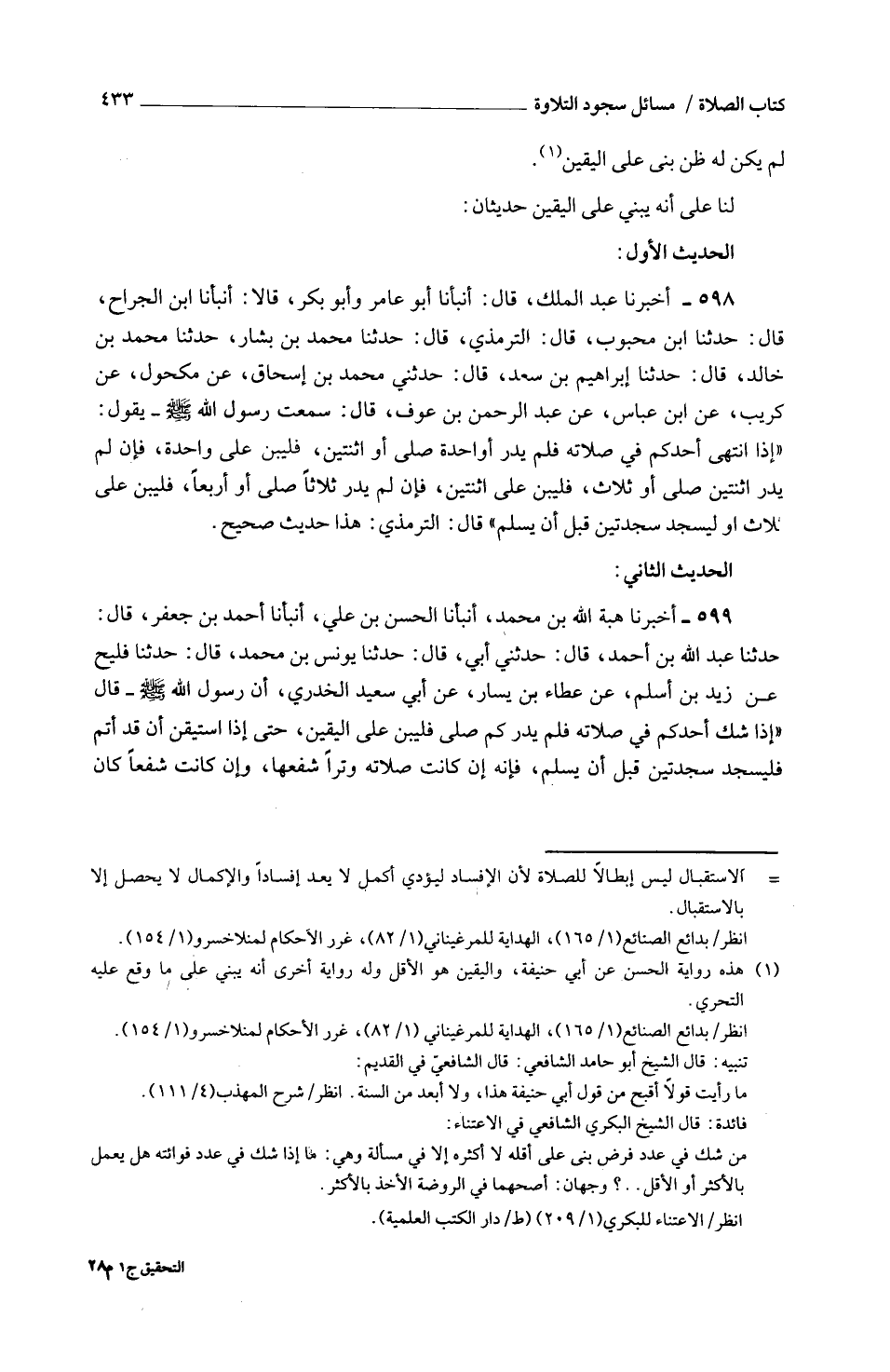 598 - أَخْبَرَنَا عَبْدُ الْمَلِكِ قَالَ أَنْبَأَنَا أَبُو عَامِرٍ وَأَبُو بَكْرٍ قَالَا أَنْبَأَنَا ابْنُ الْجَرَّاحِ قَالَ حَدَّثَنَا ابْنُ مَحْبُوبٍ قَالَ التِّرْمِذيُّ قَالَ حَدَّثَنَا مُحَمَّدُ بْنُ بَشَّارٍ حَدَّثَنَا مُحَمَّدُ بْنُ خَالِدٍ قَالَ حَدَّثَنَا إِبْرَاهِيمُ بْنُ سَعْدٍ قَالَ حَدَّثَنِي مُحَمَّدُ بْنُ إِسْحَاقَ عَنْ مَكْحُولٍ عَنْ كُرَيْبٍ عَنِ ابْنِ عَبَّاسٍ عَنْ عَبْدِ الرَّحْمَنِ بْنِ عَوْفٍ قَالَ سَمِعْتُ رَسُولَ اللَّهِ صَلَّى اللَّهُ عَلَيْهِ وَسَلَّمَ يَقُولُ إِذا انْتهى أَحَدُكُمْ فِي صَلَاتِهِ فَلَمْ يَدْرِ أَوَاحِدَةً صَلَّى أَوِ اثْنَتَيْنِ فَلْيَبْنِ عَلَى وَاحِدَةٍ فَإِنْ لَمْ يَدْرِ اثْنَتَيْنِ صلى أَو ثَلَاث فَلْيَبْنِ عَلَى اثْنَتَيْنِ فَإِنْ لَمْ يَدْرِ ثَلَاثًا صَلَّى أَوْ أَرْبَعًا فليبن على ثَلَاث أَو ليسجد سَجْدَتَيْنِ قَبْلَ أَنْ يُسَلِّمَ قَالَ التِّرْمِذِيُّ هَذَا حَدِيثٌ صَحِيحٌ