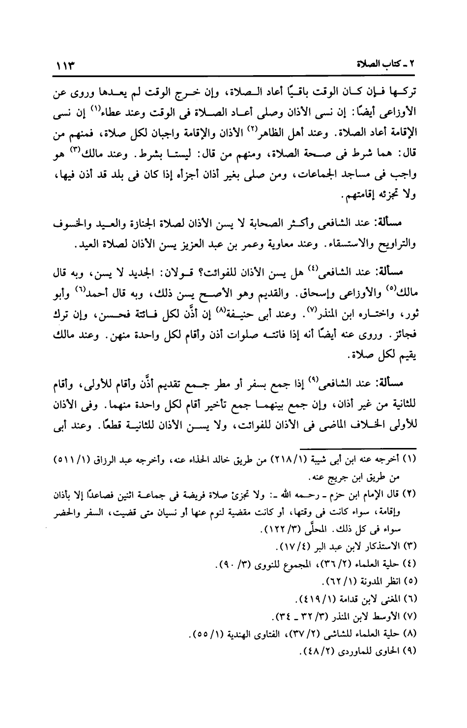 مَسْأَلَةٌ: عِنْدَ الشَّافِعِيِّ هل يسن الأذان للفوائت؟ قَوْلَانِ: الجديد لا يسن، وبه قال مالك والْأَوْزَاعِيّ وإِسْحَاق. والقديم وهو الأصح يسن ذلك، وبه قال أَحْمَد وأبو ثور، واختاره ابن المنذر. وعند أَبِي حَنِيفَةَ إن أذّن لكل فائتة فحسن، وإن ترك فجائز. وروى عنه أيضًا أنه إذا فاتته صلوات أذن وأقام لكل واحدة منهن. وعند مالك يقيم لكل صلاة.