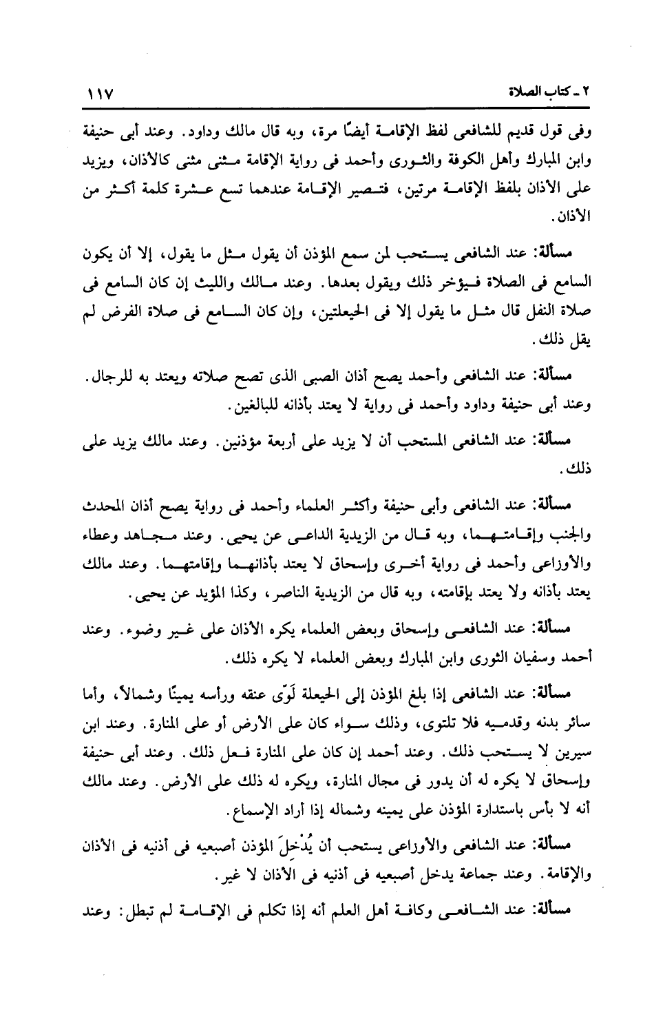 وفى قول قديم للشافعي لفظ الإقامة أيضًا مرة، وبه قال مالك وداود. وعند أَبِي حَنِيفَةَ وابن الْمُبَارَك وأهل الكوفة والثَّوْرِيّ وَأَحْمَد في رِوَايَة الإقامة مثنى مثنى كالأذان، ويزيد على الأذان بلفظ الإقامة مرتين، فتصير الإقامة عندهما تسع عشرة كلمة أكثر من الأذان.