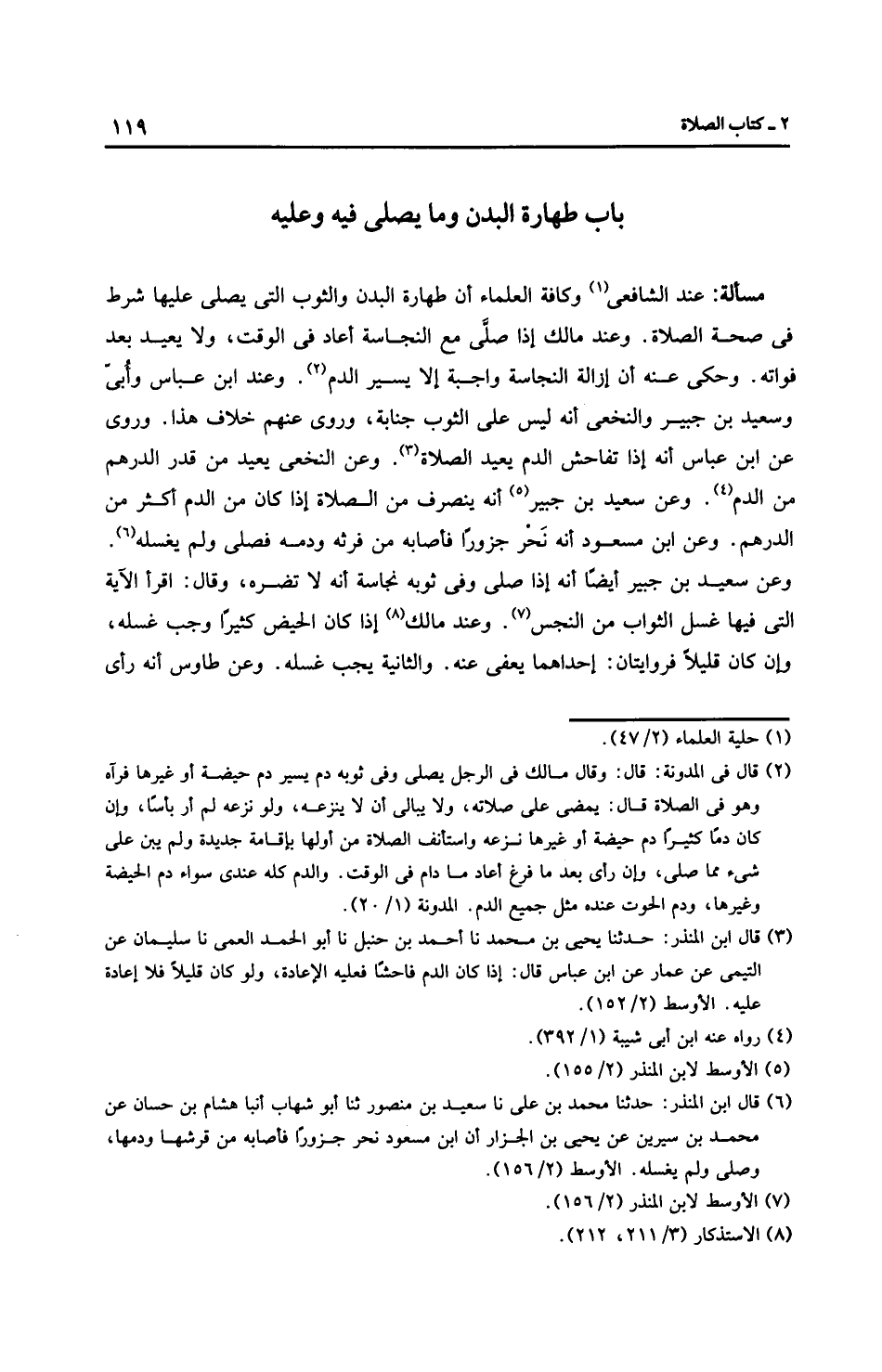 مَسْأَلَةٌ: عِنْدَ الشَّافِعِيِّ وكافة العلماء أن طهارة البدن والثوب التي يصلي عليها شرط فى صحة الصلاة. وعند مالك إذا صلَّى مع النجاسة أعاد في الوقت، ولا يعيد بعد فواته. وحكى عنه أن إزالة النجاسة واجبة إلا يسير الدم. وعند ابن عَبَّاسٍ وأبيّ وسعيد بن جبير والنَّخَعِيّ أنه ليس على الثوب جنابة، وروى عنهم خلاف هذا. وروى عن ابن عَبَّاسٍ أنه إذا تفاحش الدم يعيد الصلاة. وعن النَّخَعِيّ يعيد من قدر الدرهم من الدم. وعن سعيد بن جبير أنه ينصرف من الصلاة إذا كان من الدم أكثر من الدرهم. وعن ابن مسعود أنه نَحْر جزورًا فأصابه من فرثه ودمه فصلى ولم يغسله. وعن سعيد بن جبير أيضًا أنه إذا صلى وفي ثوبه نجاسة أنه لا تضره، وقال: اقرأ الآية التي فيها غسل [الثوب] من النجس. وعند مالك إذا كان الحيض كثيرًا وجب غسله، وإن كان قليلًا فرِوَايَتَانِ: إحداهما يعفى عنه. والثانية يجب غسله. وعن طاوس أنه رأي