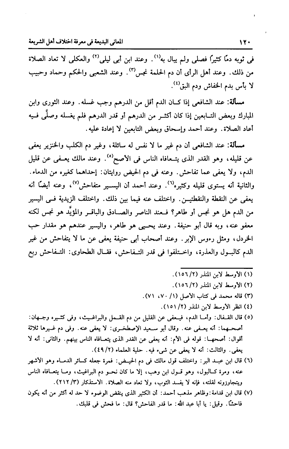 مَسْأَلَةٌ: عِنْدَ الشَّافِعِيِّ إذا كان الدم أقل من الدرهم وجب غسله. وعند الثَّوْرِيّ وابن الْمُبَارَك وبعض التابعين إذا كان أكثر من الدرهم أو قدر الدرهم فلم يغسله وصلى فيه أعاد الصلاة. وعند أَحْمَد وإِسْحَاق وبعض التابعين لا إعادة عليه.