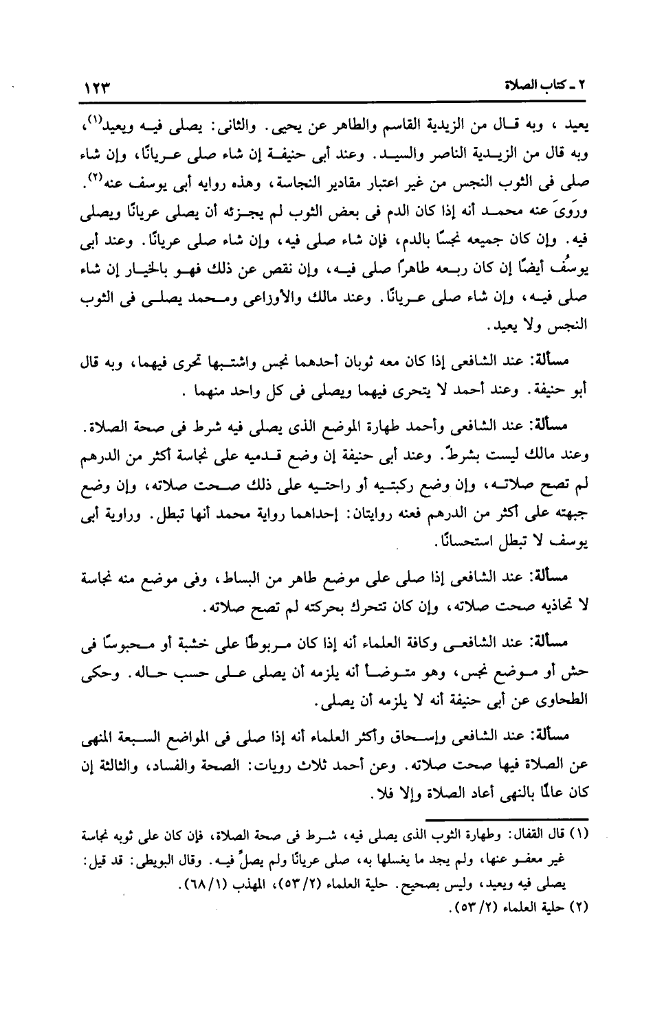 يعيد، وبه قال من الزَّيْدِيَّة القاسم والطاهر عن يَحْيَى. والثاني: يصلي فيه ويعيد، وبه قال من الزَّيْدِيَّة النَّاصِر والسيد. وعند أَبِي حَنِيفَةَ إن شاء صلى عريانًا، وإن شاء صلى في الثوب النجس من غير اعتبار مقادير النجاسة، وهذه رِوَايَة أَبِي يُوسُفَ عنه. ورَويَ عنه مُحَمَّد أنه إذا كان الدم في بعض الثوب لم يجزئه أن يصلي عريانًا ويصلي فيه. وإن كان جميعه نجسًا بالدم، فإن شاء صلى فيه، وإن شاء صلى عريانًا. وعند أبي يوسُف أيضًا إن كان ربعه طاهرًا صلى فيه، وإن نقص عن ذلك فهو بالخيار إن شاء صلى فيه، وإن شاء صلى عريانًا. وعند مالك والْأَوْزَاعِيّ ومُحَمَّد يصلي في الثوب النجس ولا يعيد.