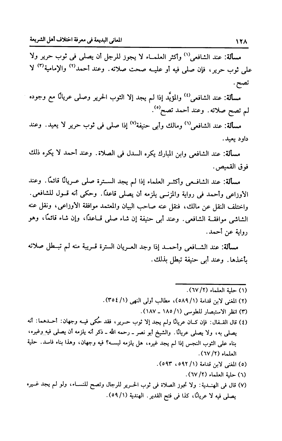 مَسْأَلَةٌ: عِنْدَ الشَّافِعِيِّ وأَكْثَر الْعُلَمَاءِ لا يجوز للرجل أن يصلي في ثوب حرير ولا على ثوب حرير، فإن صلى فيه أو عليه صحت صلاته. وعند أَحْمَد والْإِمَامِيَّة لا تصح.