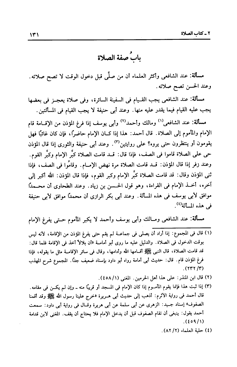 مَسْأَلَةٌ: عِنْدَ الشَّافِعِيِّ وَمَالِك وَأَحْمَد وأَبِي يُوسُفَ إذا فرغ المؤذن من الإقامة قام الإمام والمأموم إلى الصلاة. قال أحمد: هذا إذا كان الإمام حاضرًا، فإن كان غائبًا فهل يقومون أو ينتظرون حتى يروه؟ على روايتين. وعند أَبِي حَنِيفَةَ والثَّوْرِيّ إذا قال المؤذن حي على الصلاة قاموا في الصف، فإذا قال: قد قامت الصلاة كبَّر الإمام وكبَّر القوم. وعند زفر إذا قال المؤذن: قد قامت الصلاة مرة نهض الإمام. وقامُوا في الصف، فإذا ثنى المؤذن وقال: قد قامت الصلاة كبَّر الإمام وكبر القوم، فإذا قال المؤذن: الله أكبر إلى آخره، أخذ الإمام في القراءة، وهو قول الحسن بن زياد. وعند الطحاوي أن محمدًا موافق لأَبِي يُوسُفَ في هذه المسألة. وعند أبي بكر الرازي أن محمدًا موافق لأَبِي حَنِيفَةَ فى هذه المسألة.