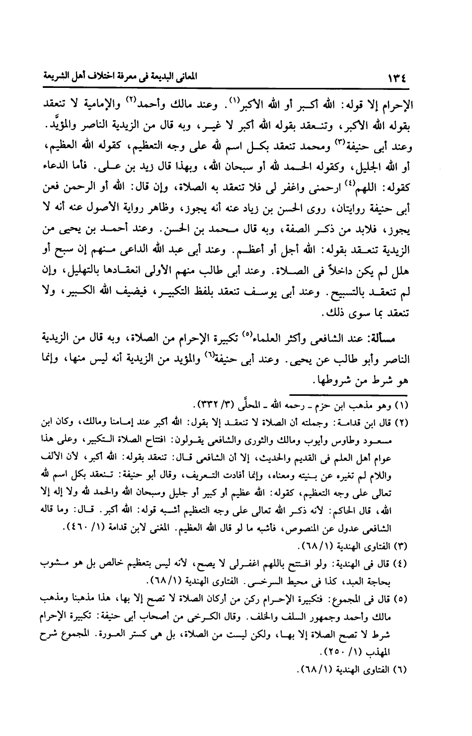 الإحرام إلا قوله: اللَّه أكبر أو الله الأكبر. وعند مالك وَأَحْمَد والْإِمَامِيَّة لا تنعقد بقوله اللَّه الأكبر، وتنعقد بقوله الله أكبر لا غير، وبه قال من الزَّيْدِيَّة النَّاصِر والمؤيَّد. وعند أَبِي حَنِيفَةَ ومُحَمَّد تنعقد بكل اسم لله على وجه التعظيم، كقوله الله العظيم، أو الله الجليل، وكقوله الحمد للَّهِ أو سبحان الله، وبهذا قال زيد بن علي. فأمَّا الدعاء كقوله: اللهم ارحمني واغفر لي فلا تنعقد به الصلاة، وإن قال: الله أو الرحمن فعن أَبِي حَنِيفَةَ رِوَايَتَانِ، روى الحسن بن زياد عنه أنه يجوز، وظاهر رِوَايَة الأصول عنه أنه لا يجوز، فلابد من ذكر الصفة، وبه قال مُحَمَّد بن الحسن. وعند أَحْمَد بن يَحْيَى من الزَّيْدِيَّة تنعقد بقوله: الله أجل أو أعظم. وعند أبي عبد الله الداعي منهم إن سبح أو هلل لم يكن داخلاً في الصلاة. وعند أبي طالب منهم الأولى انعقادها بالتهليل، وإن لم تنعقد بالتسبيح. وعند أَبِي يُوسُفَ تنعقد بلفظ التكبير، فيضيف الله الكبير، ولا تنعقد بما سوى ذلك.